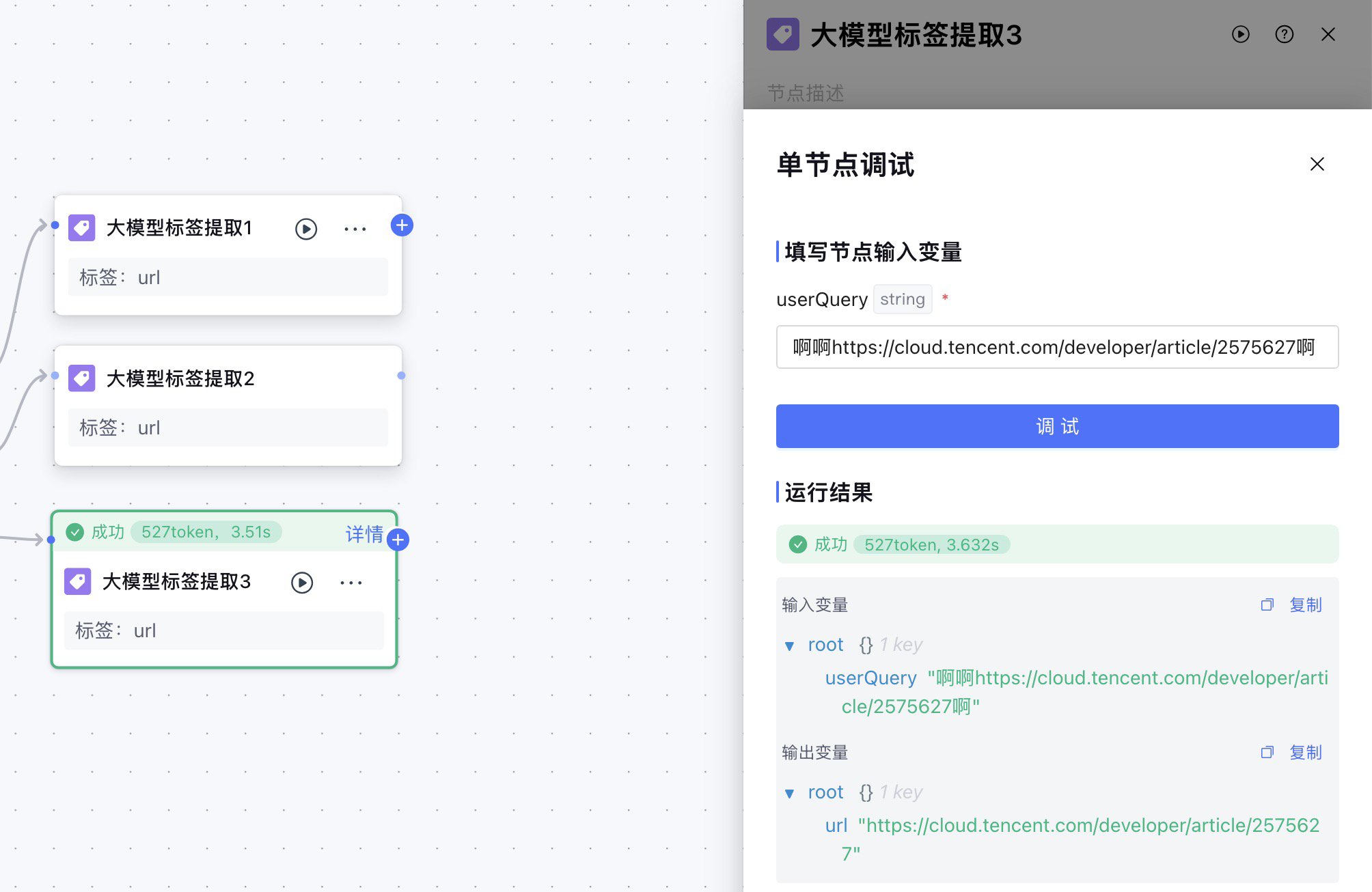 三个大模型标签提取节点大致都一样,只不过提示词中要提取的url不一样,然后我进行节点调试。