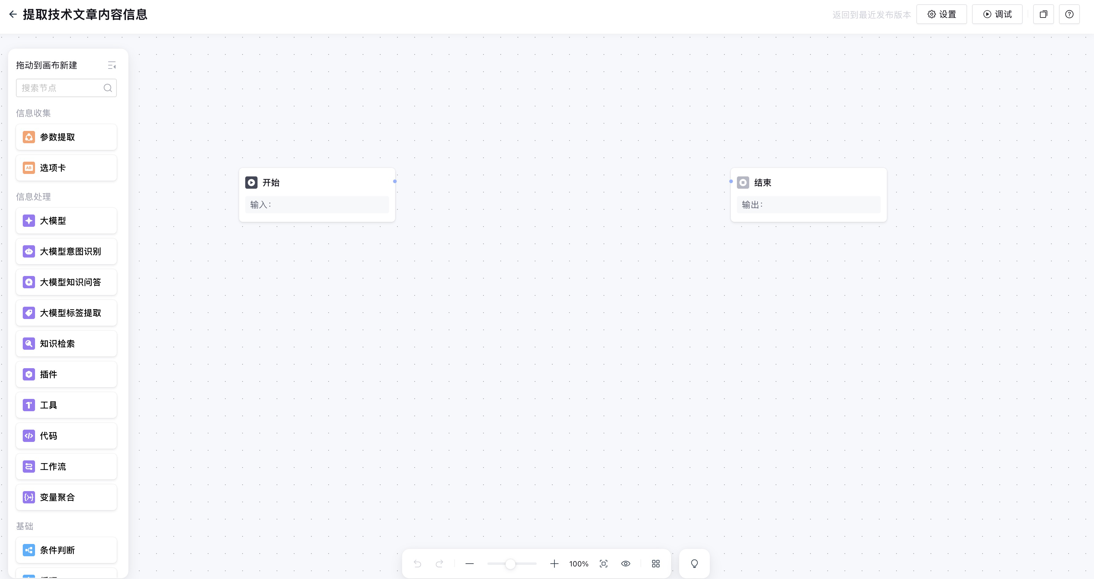 在新建的工作流编排界面中,默认有两个节点:开始和结束。一个完整的工作流,这两个节点是必须存在的。