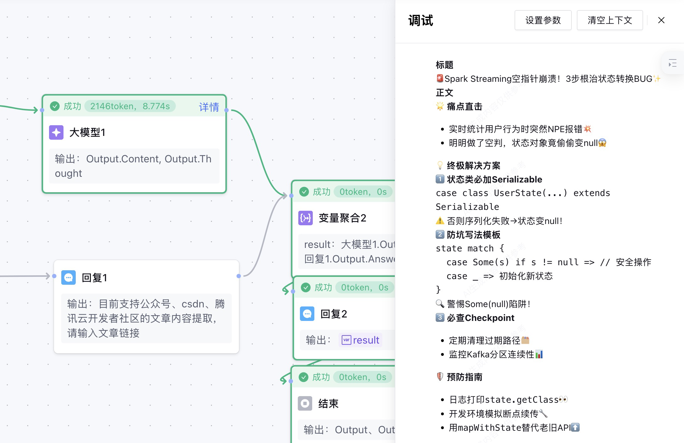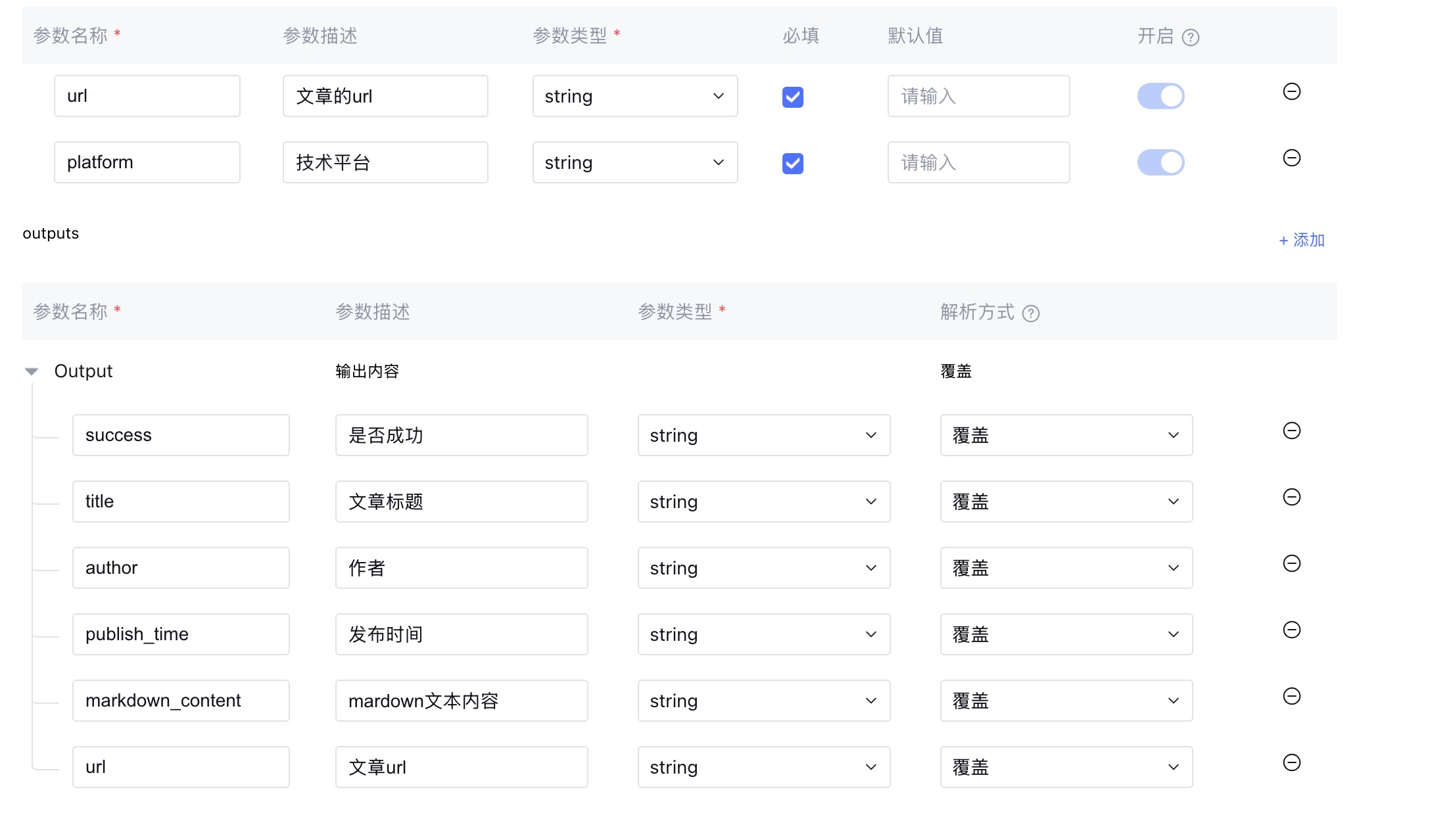 可以看到入参就是之前大数据提取标签节点的两个输出变量:url和platform。出参就是文章的标题、作者、发布时间,以及最最重要的文章文本内容。这里返回的是发布时原始的markdown文本内容,而不是纯文本。