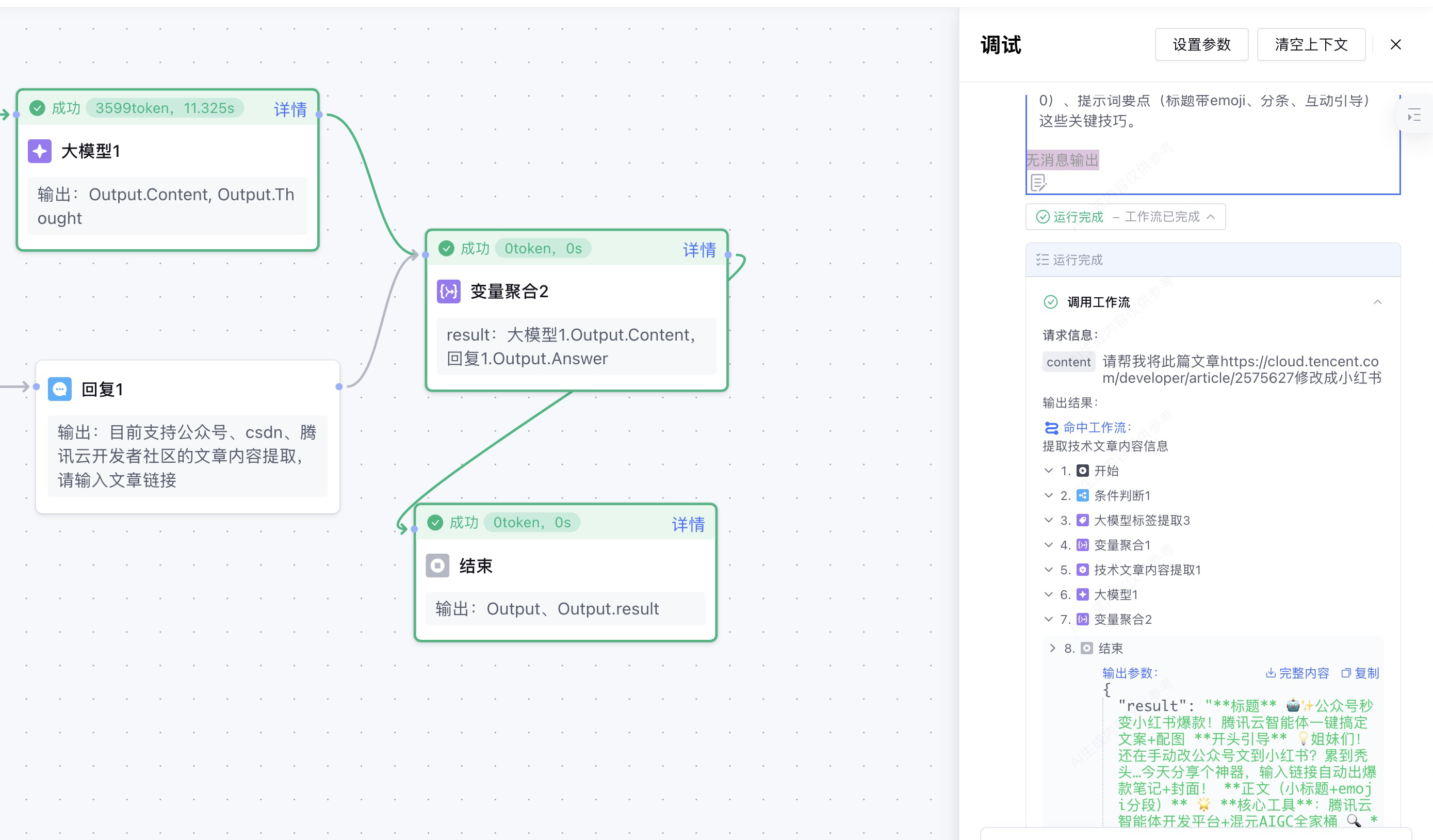 开始调试:在对话框中输入:“请帮我将此篇文章https://cloud.tencent.com/developer/article/2572080修改成小红书”,然后就开始调用工作流,在工作流正常调用之后。发现没有消息输出。查看工作流节点处理过程,发现在结束节点成功输出了。
