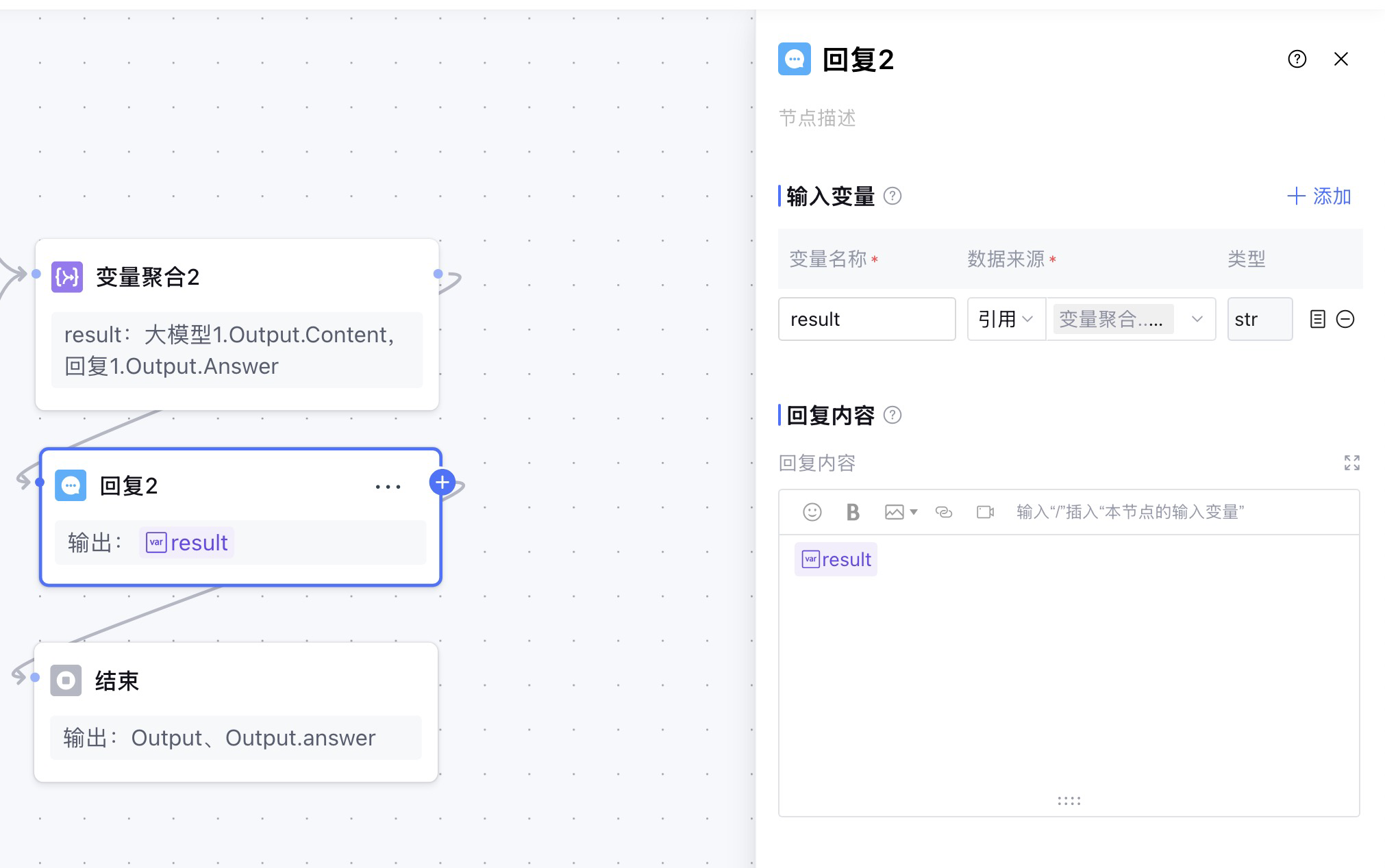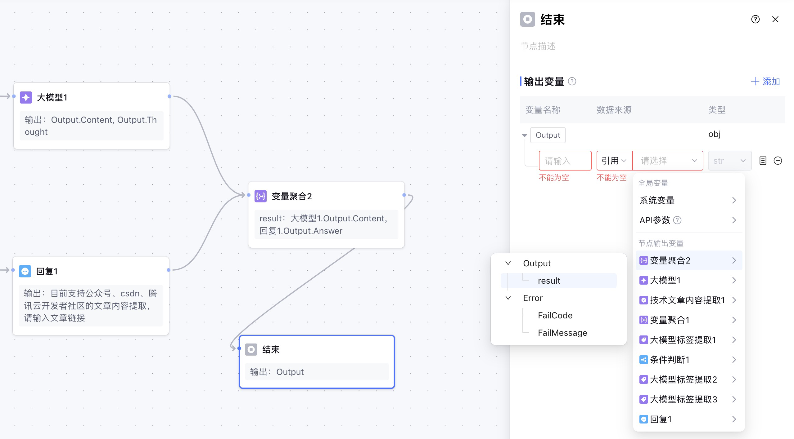 最后聚合变量再连接到结束节点,这样就完成了开始到结束节点的工作流编排。