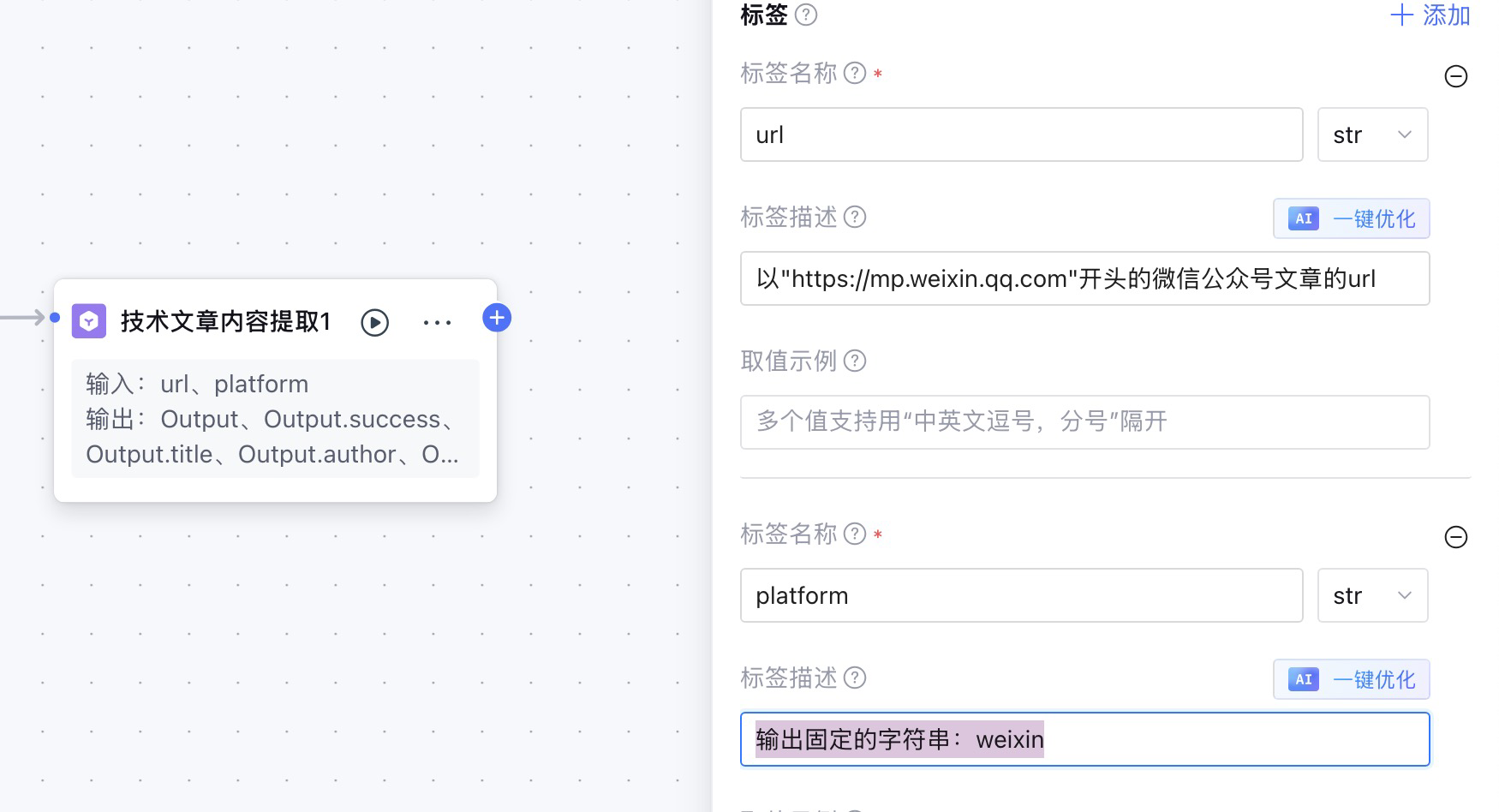大模型标签提取节点除了输出提取的url之外,我还需要输出一个固定值platform,这和我后面的设计有关,我要调用自定义的工具,通过传入platform来判断调用哪个平台的解析方法。例如platform=weixin,就调用微信公众号的网页解析,platform=tencentcloud,就调用腾讯云开发者社区的解析。当然,这一块也可以在后端接口实现,通过url的domain来路由相应的解析,这是程序设计上的问题,暂不讨论。