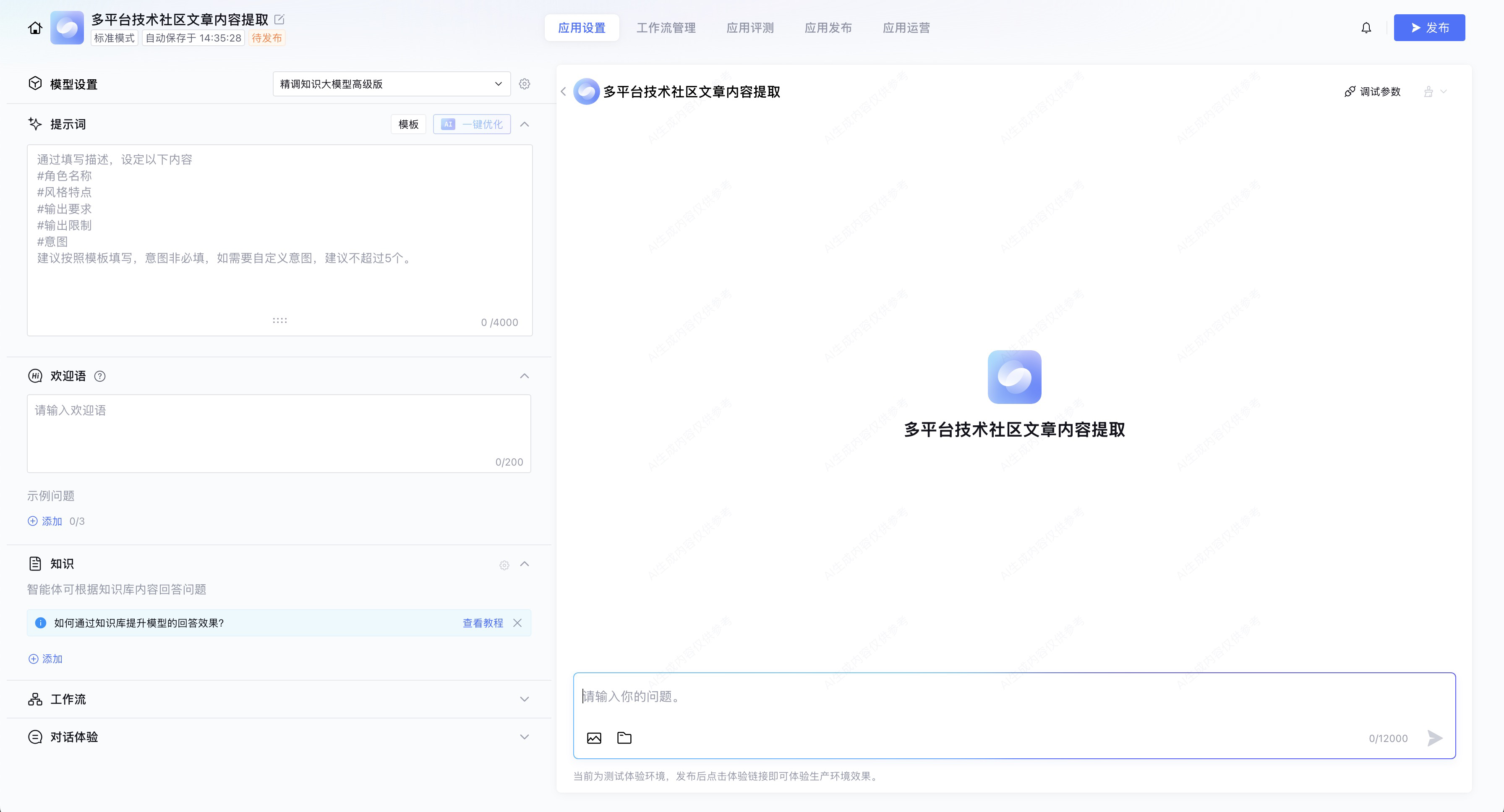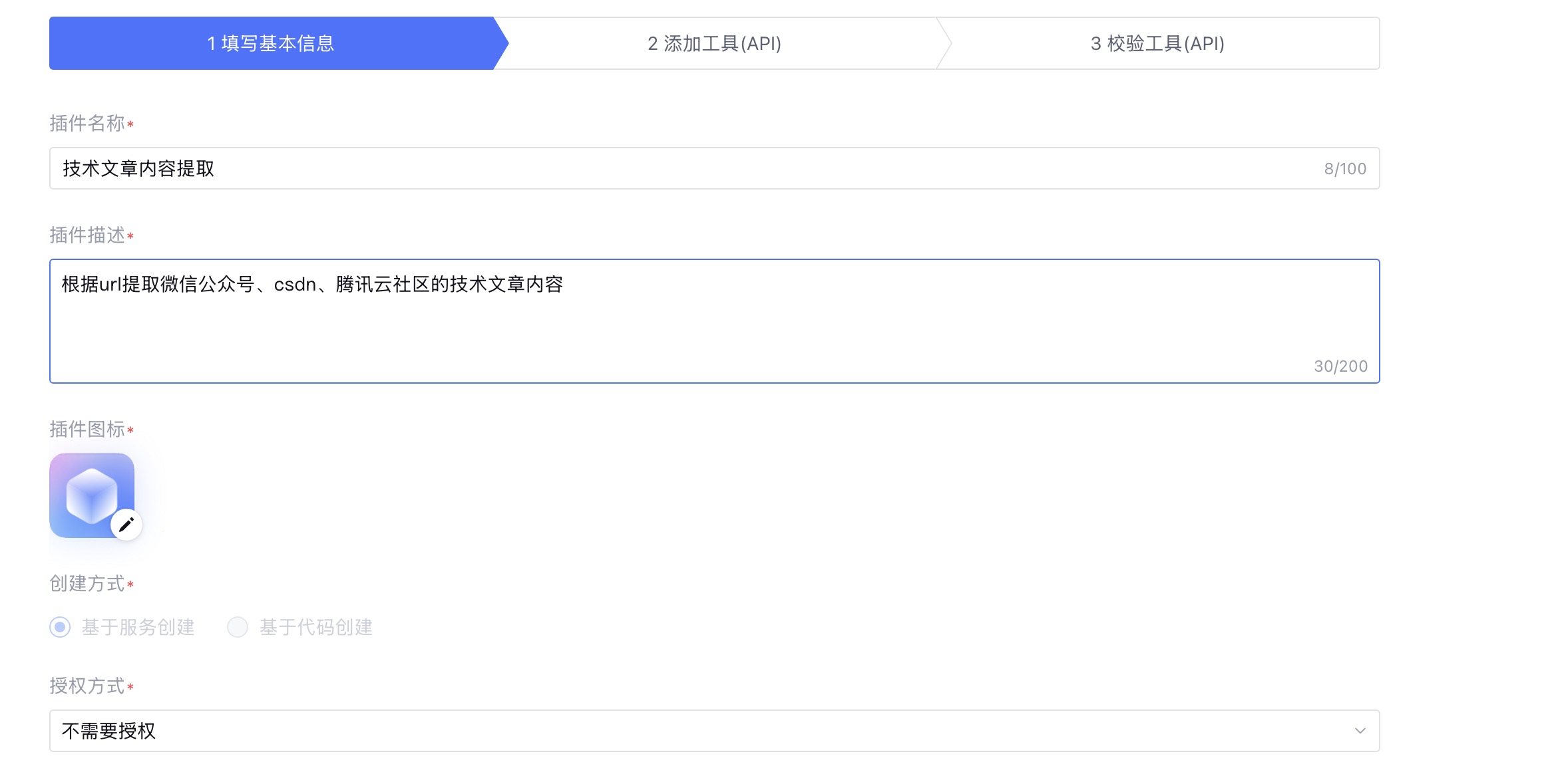 这里我们填入智能体的名称以及简介:支持根据url自动提取微信公众号、csdn、腾讯云开发者社区的文章内容,包括文章标题、发布时间、文章的markdown内容等信息