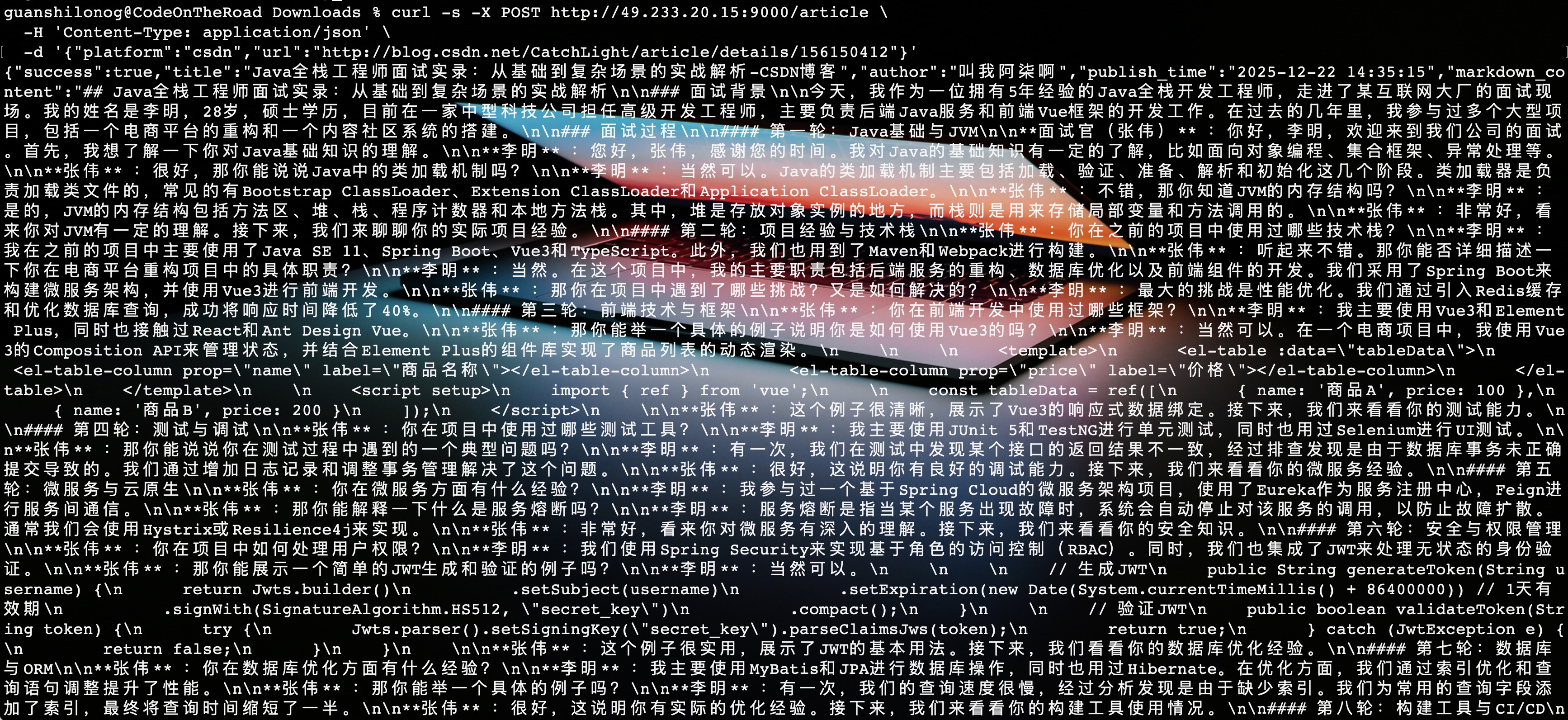 我们通过curl来测试接口,看到 markdown_content 返回的是markdown文本。