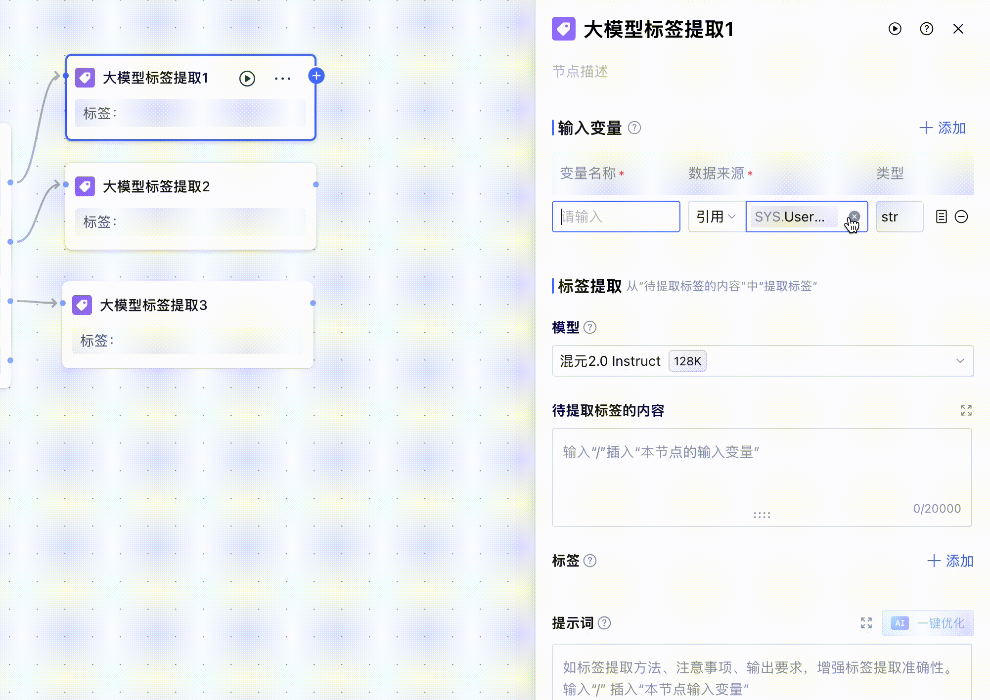 然后就是开始告诉大模型要提取的内容,我在待提取的标签内容和提示词中输入了同样的内容,在输入提示词的过程中,输入/之后,就会自动弹出我们定义的变量,我们在上面定义了 userQuery 这个变量,即开始节点的用户输入,在提示词中告诉大模型:我想要提取什么标签内容、格式是什么。