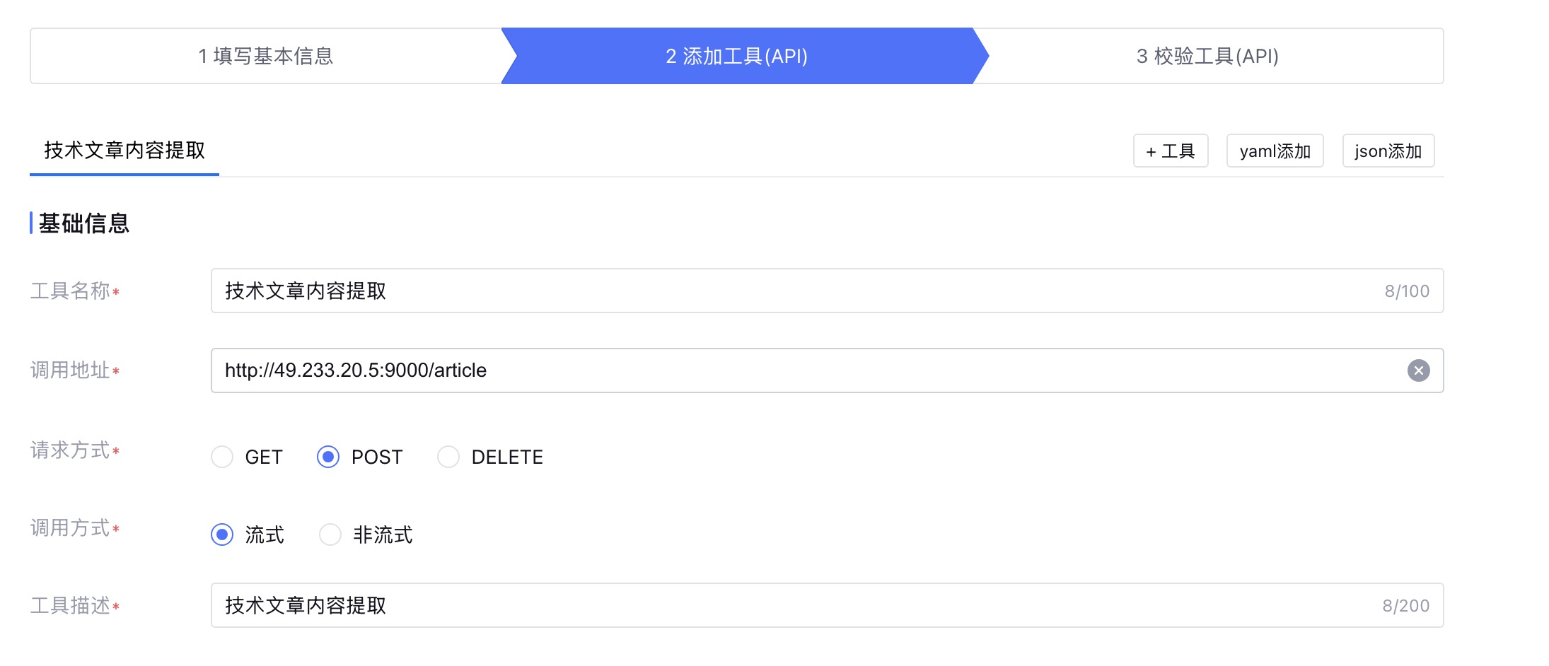 点击下一步,进入到添加工具(API)的页面,在这里就是配置接口的地址、请求方式,以及入参和出参。