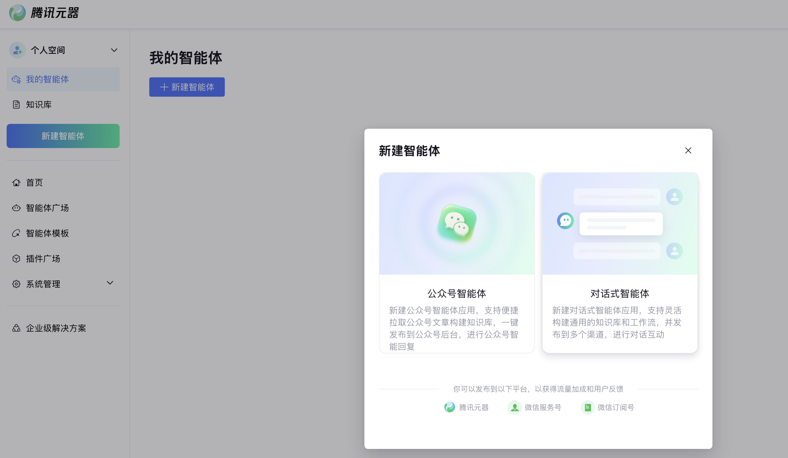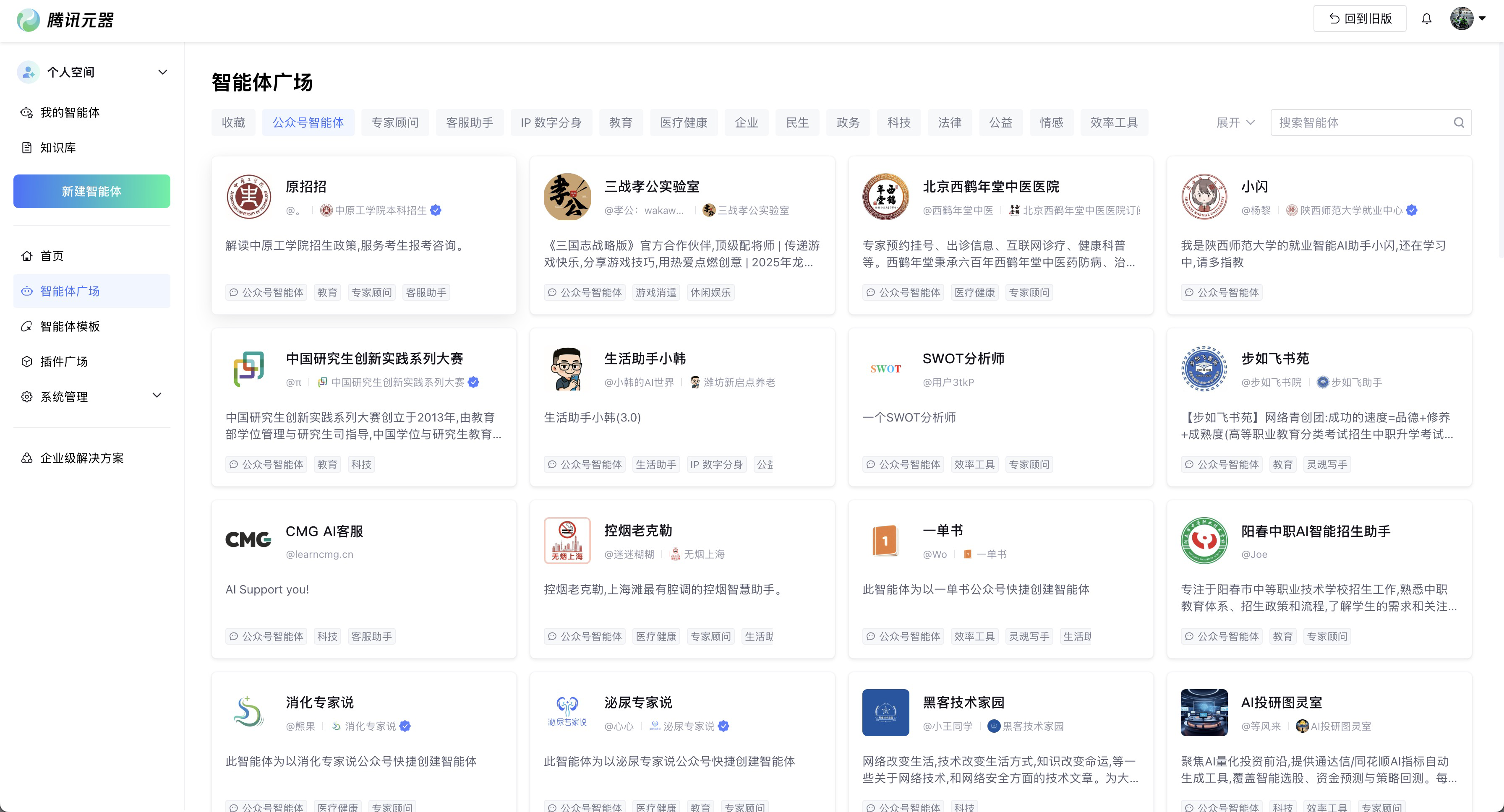 我们进入腾讯元器首页,可以看到智能体广场,在这里我们可以看到很多别人已经发布的智能体,我们可以直接使用这些智能体来实现自己的需求。