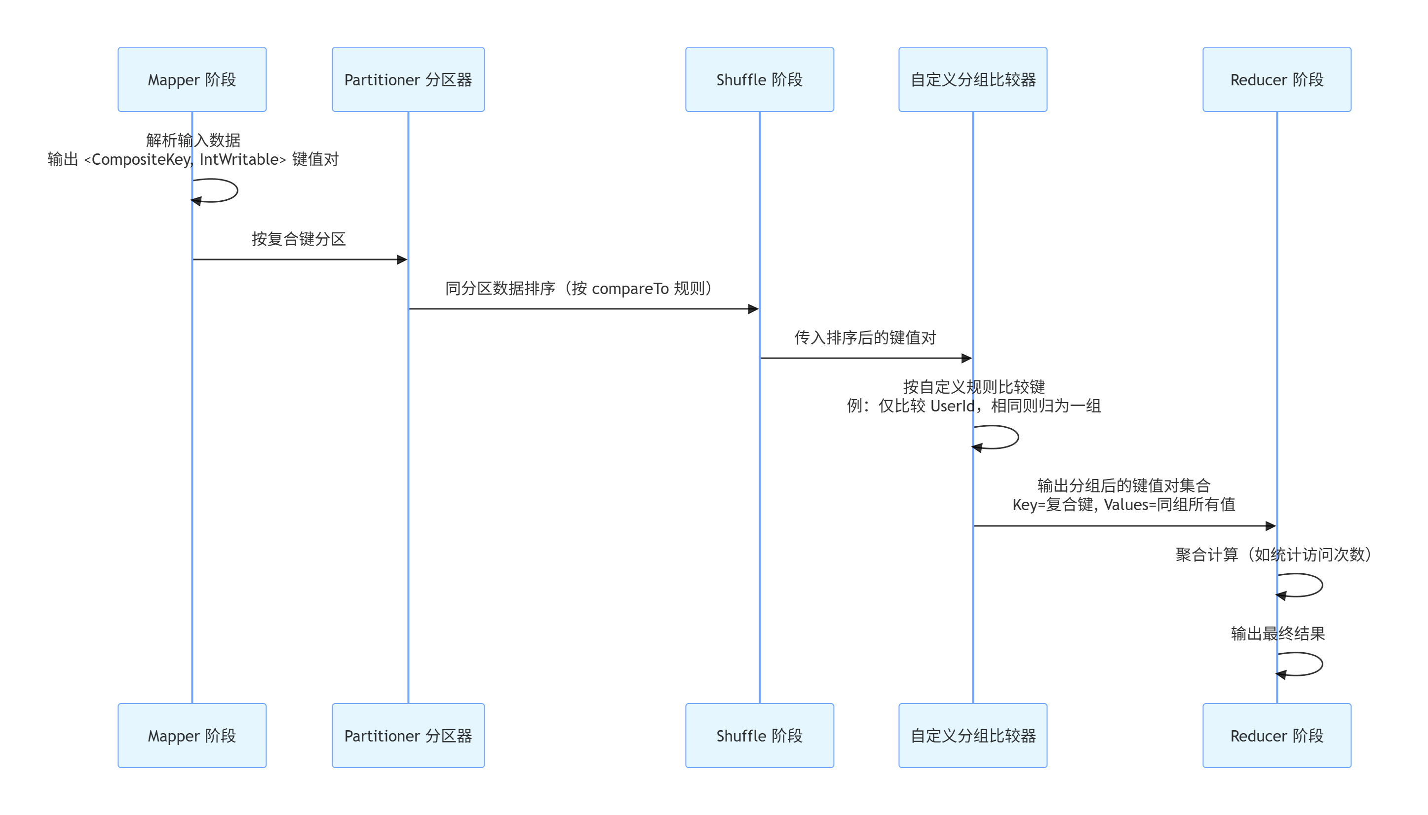 2023-10-01 12:05:00, user2 2在Hadoop中,GroupingComparator 是一个重要的组件,用于控制MapReduce作业中的键值对如何分组。默认情况下,Hadoop使用键的自然排序来分组,但有时我们需要根据特定的业务逻辑来自定义分组规则。下面通过一个具体的例子来展示如何实现和使用自定义的 GroupingComparator。