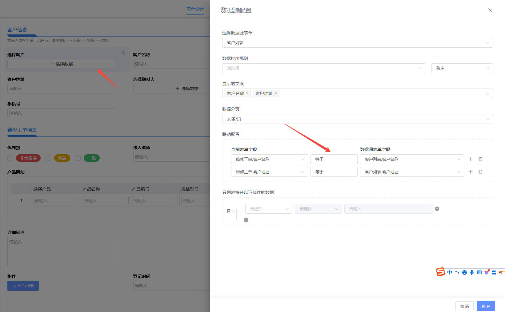 4、现在需要实现选择客户时候,需要自动把客户名称,客户地址也填写上,这时候就需要配置数据联动,点击选择客户组件,选择数据源配置,配置如下: