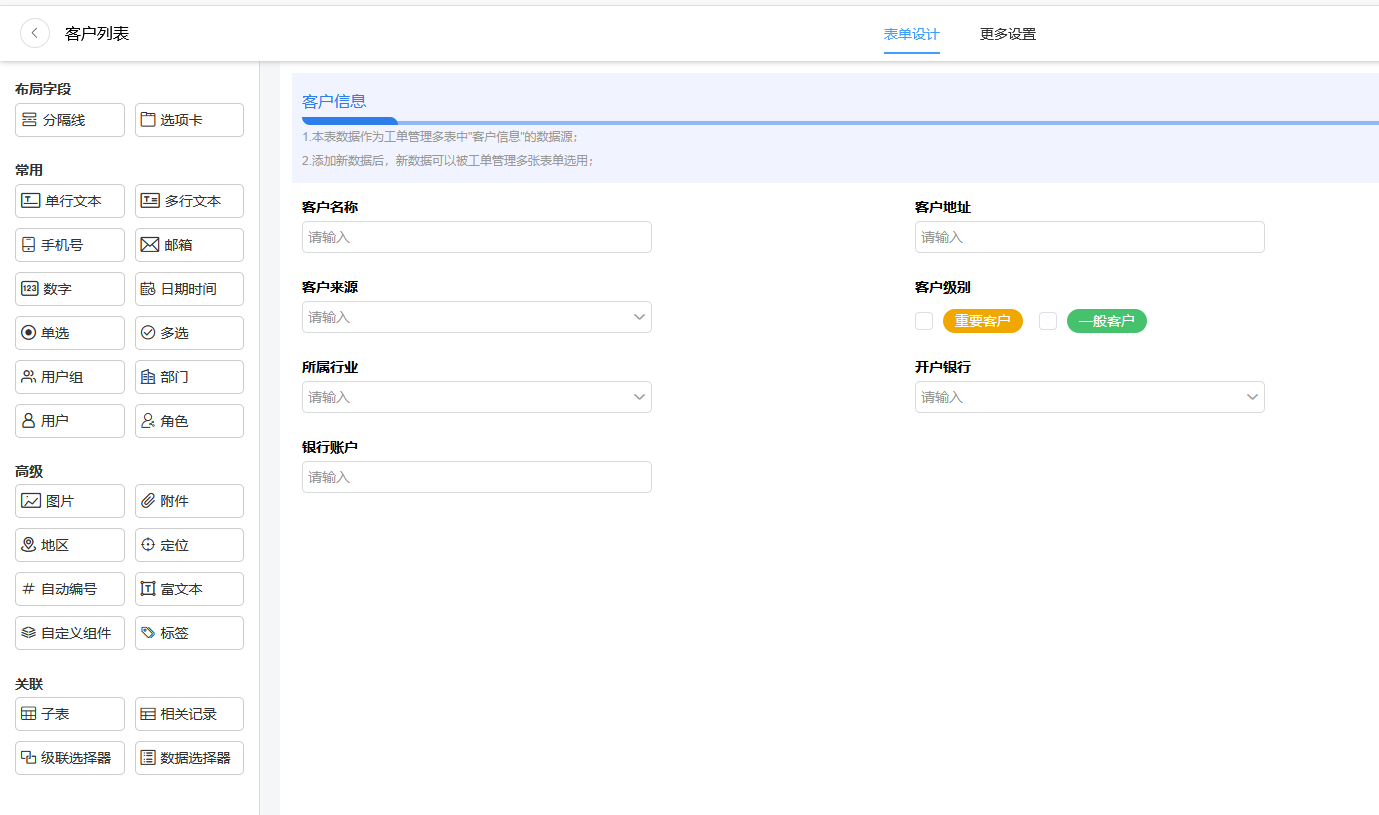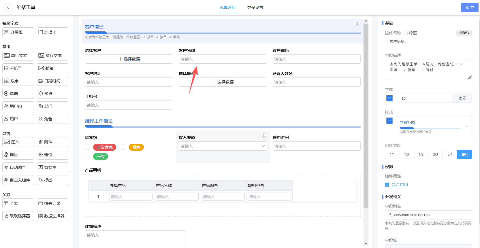 3、进入工单数据表单配置界面,工单数据除了包含工单本身的数据外,为了让工单信息更直观,设计表单时候也会包含了客户名称,客户地址等基本信息,表单结构如下图: