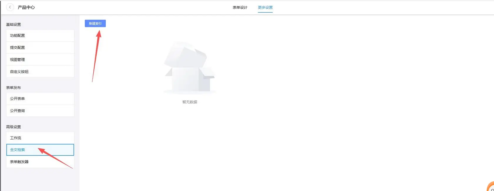 1、进入表单管理后台,进入对应表单的配置界面,点击全文检索,如下图