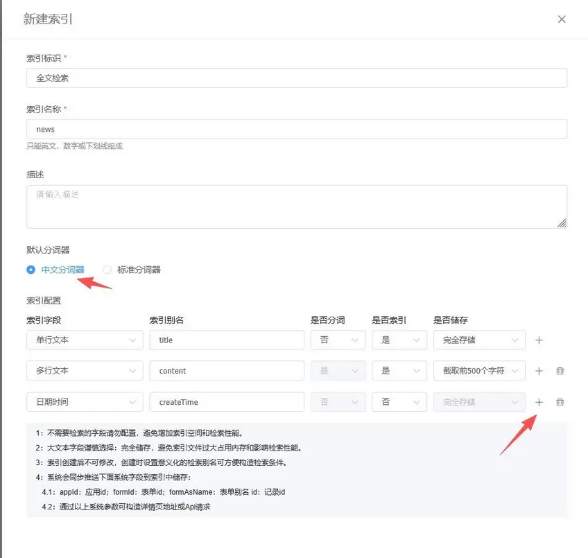 1:不需要检索的字段请勿配置,避免增加索引空间和检索性能。