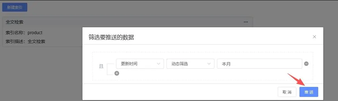 3、配置后需要推送数据到搜索引擎中,回到索引管理界面,点击推送按钮,如下图: