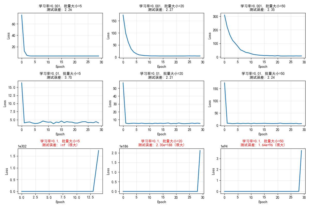 • 3x3网格显示不同学习率和批量大小组合下的训练过程