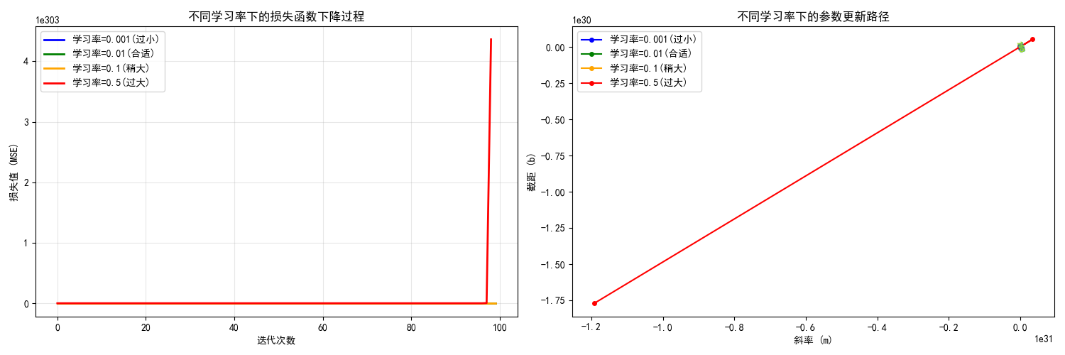 我们以线性回归为例,演示超参数(学习率和迭代次数)对模型训练的影响。我们将使用自定义数据,并绘制损失函数随迭代次数的变化曲线,以及模型参数更新的路径。