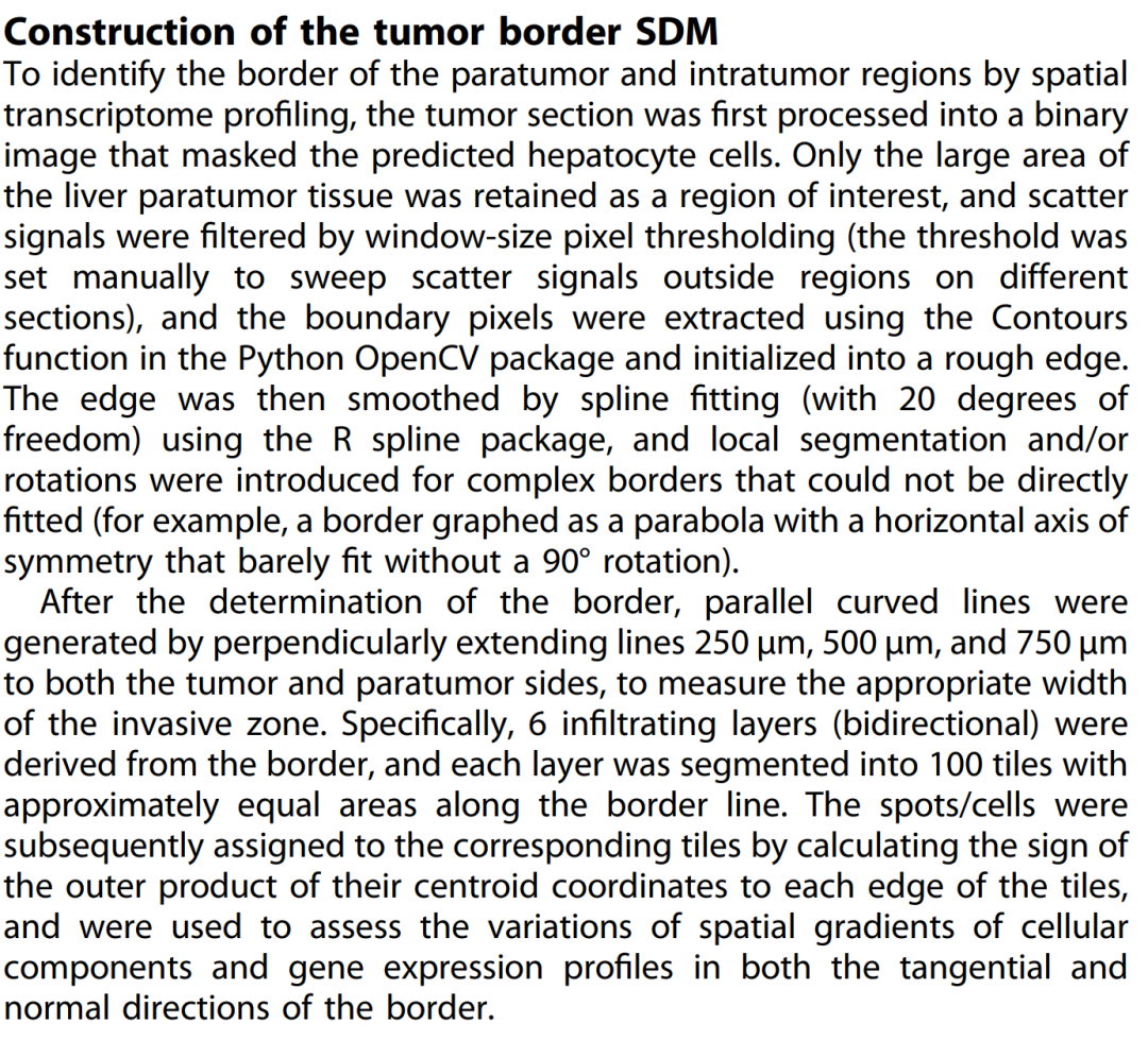 之前我们也有介绍过一篇23年的空间文章,研究的一个核心概念是肿瘤边缘的"侵袭区",文章中定义的是以肿瘤边缘为中心的500微米宽的区域,这里是肿瘤细胞侵袭和转移的活跃前沿,包含复杂的细胞成分及独特的分子特征,存在免疫抑制微环境、肿瘤细胞代谢重编程及受损肝细胞,对肿瘤进展和患者预后有关键影响。这个区域在肿瘤侵袭和转移中具有重要地位,文章后续都是围绕其位置、细胞组成、分子特征以及功能作用进行详细描述。