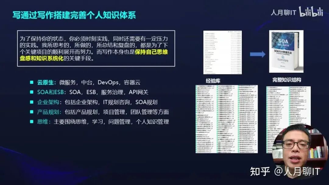 我日常工作实践学习的东西,就会把它记录下来写下来。不管是看一本书的学习笔记,还是做完一件事情以后的复盘总结。这些东西刚开始都是离散的,但过了半年一年,我又会把这些离散的东西做进一步的归纳总结,形成一个完整的知识体系。包括在2020年,我出了一本关于《SOA与大数据》的书,也是这么一个道理。