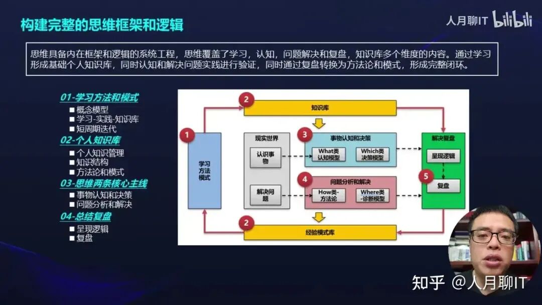在这个框架模型里面,我提到了两条主线:第一个是对事物的认知和分析,第二个是问题的分析和解决。事物认知这条主线是理解世界,问题解决是改造世界。事物认知用的是归纳逻辑,问题解决用的是演绎逻辑。事物认知和问题解决实际上是我们执行的过程,执行过程在中间。前面有一个输入的过程是我们的学习,执行完了有结果,这个结果我们要复盘。所以最终仍然是叫学习-实践-复盘。通过这么一个持续的迭代,完成从资料库到知识库、知识库到经验模式库的转化。关于我个人对思维框架模型的详细阐述,大家可以看一下我公众号的文章。