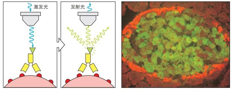 免疫荧光显微镜:利用不同荧光染料标记的特异性抗体对组织切片进行免疫荧光染色,可实现多靶点定位。图中显示胰岛组织:绿色荧光标记的抗谷氨酸脱羧酶(GAD)抗体特异性染色分泌胰岛素的β细胞;橙色荧光标记的抗胰高血糖素抗体则染色α细胞。该技术常用于研究I型糖尿病中,针对β细胞(GAD为重要自身抗原)的自身免疫破坏过程。