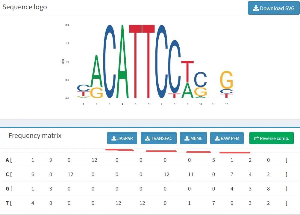 在JASPAR网址,可以看到Motif的频率矩阵存在不同格式。可以点击下载查看motif的不同格式内容。