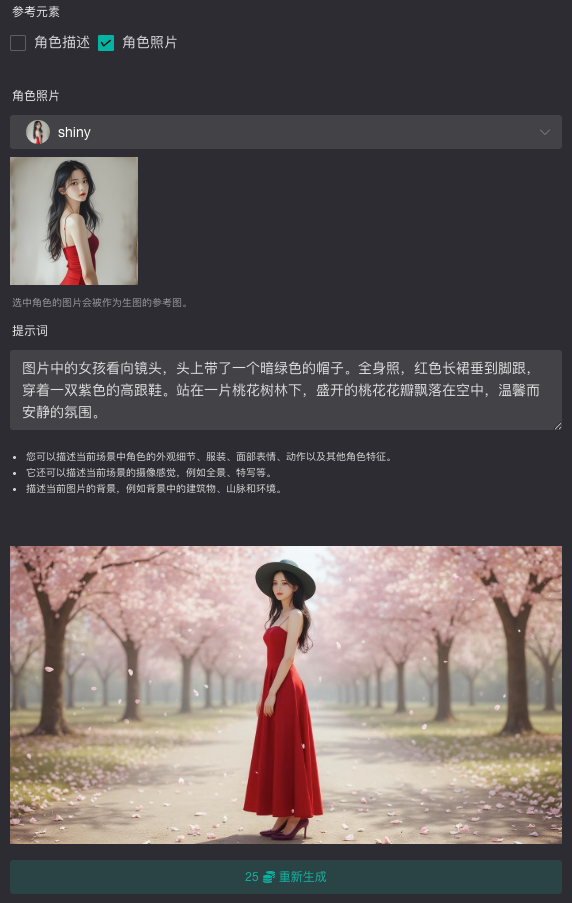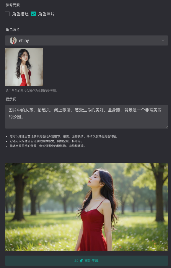 在Videa中,我们选中已经设定好的一个角色,而该角色我已经为它生成好了一张肖像照。而这张肖像照理论上其实并不好,它是一张人物的侧面照。但是当我在提示词中输入“图片中的女孩,抬起头,闭上眼睛,感受生命的美好。全身照,背景是一个非常美丽的公园”,并运行生成后,得到了下面的这张效果图,虽然从人物五官上我们也看不出人物是否一致,但是从人物的外形来说,是非常一致的。