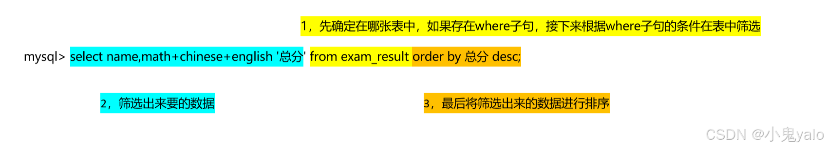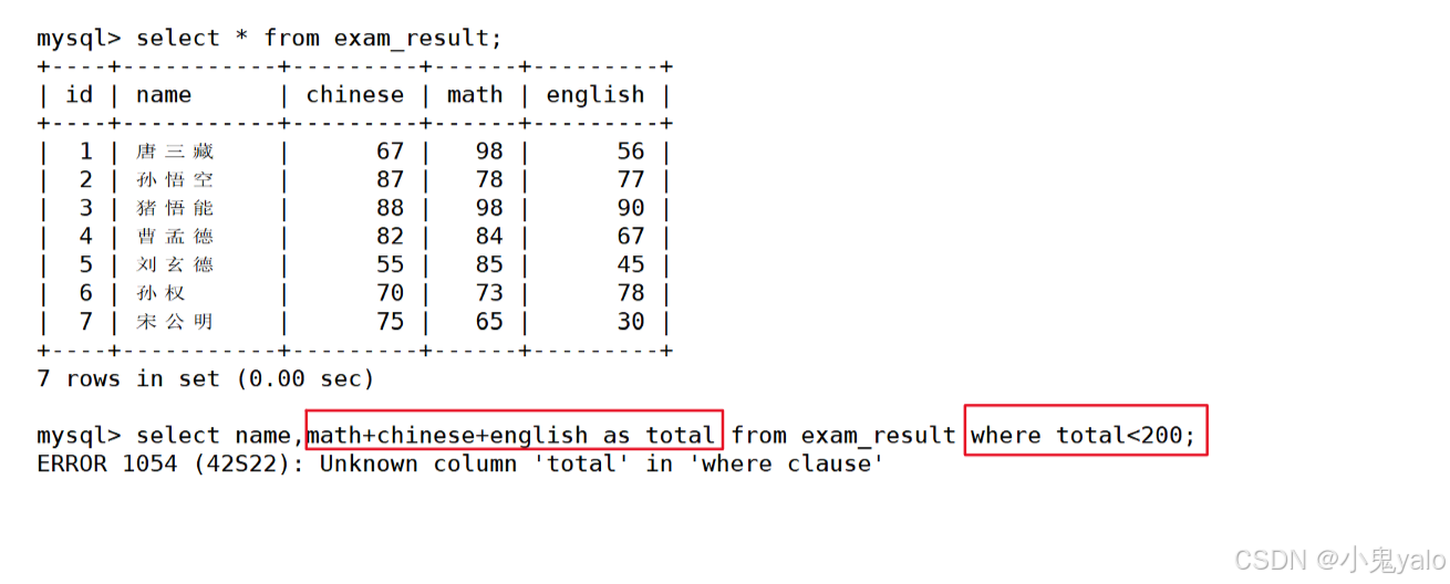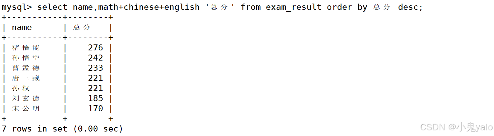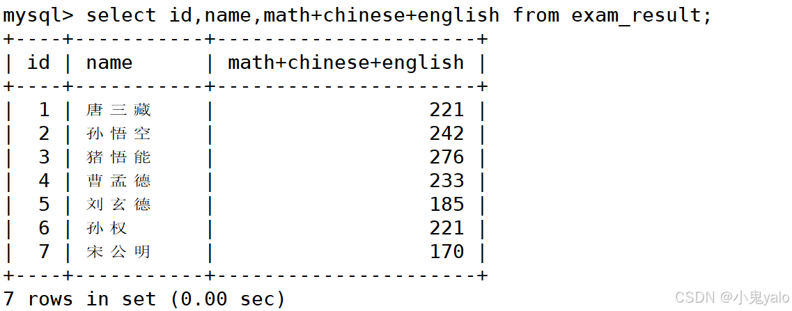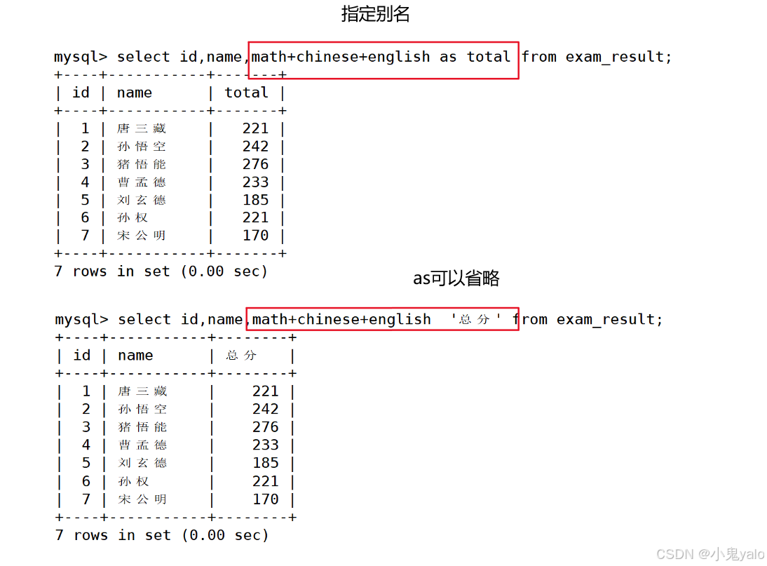 mysql> select id,name,math+chinese+english as total from exam_result; mysql> select id,name,math+chinese+english '总分' from exam_result;