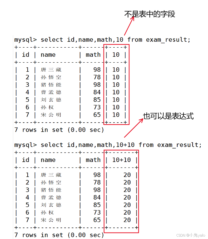 mysql> select id,name,math,10 from exam_result; mysql> select id,name,math,10+10 from exam_result;