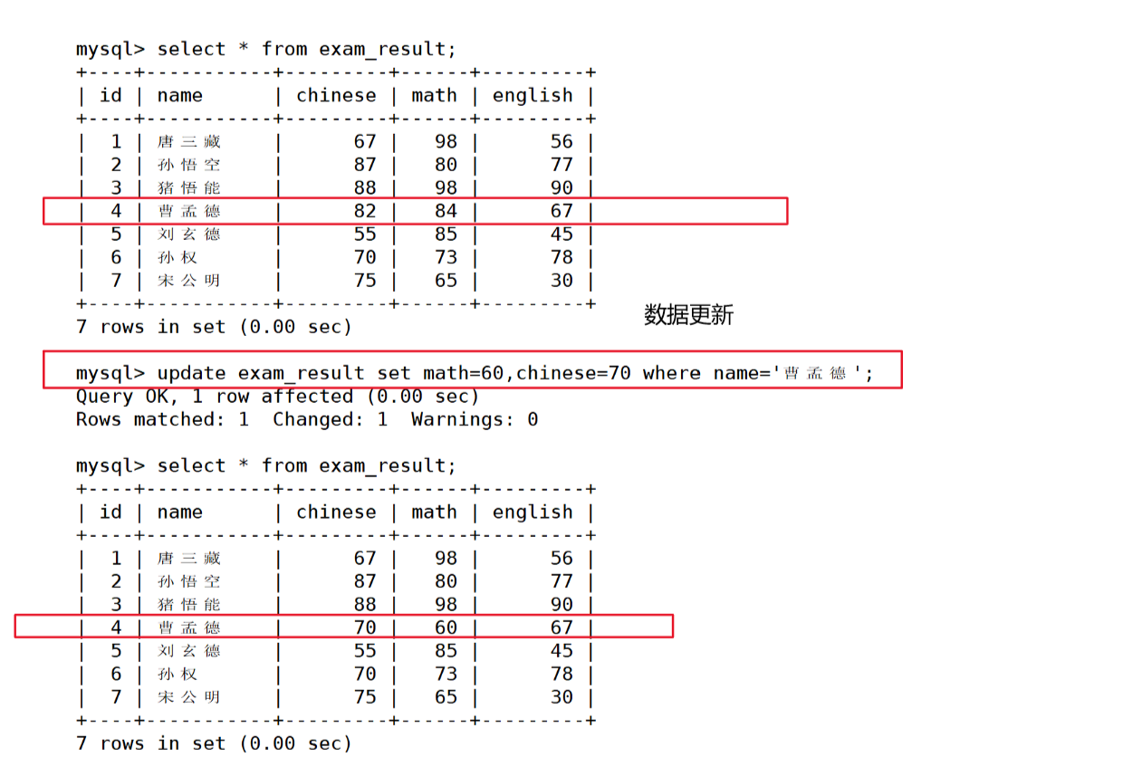 mysql> update exam_result set math=60,chinese=70 where name='曹孟德';