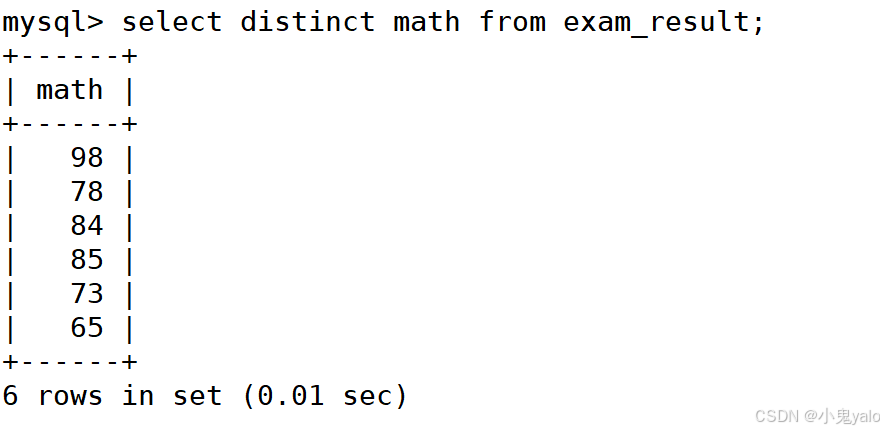 mysql> select distinct math from exam_result;