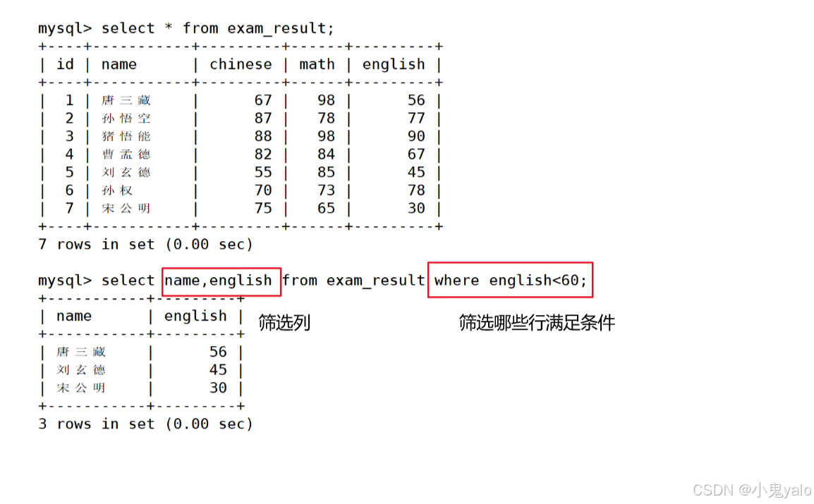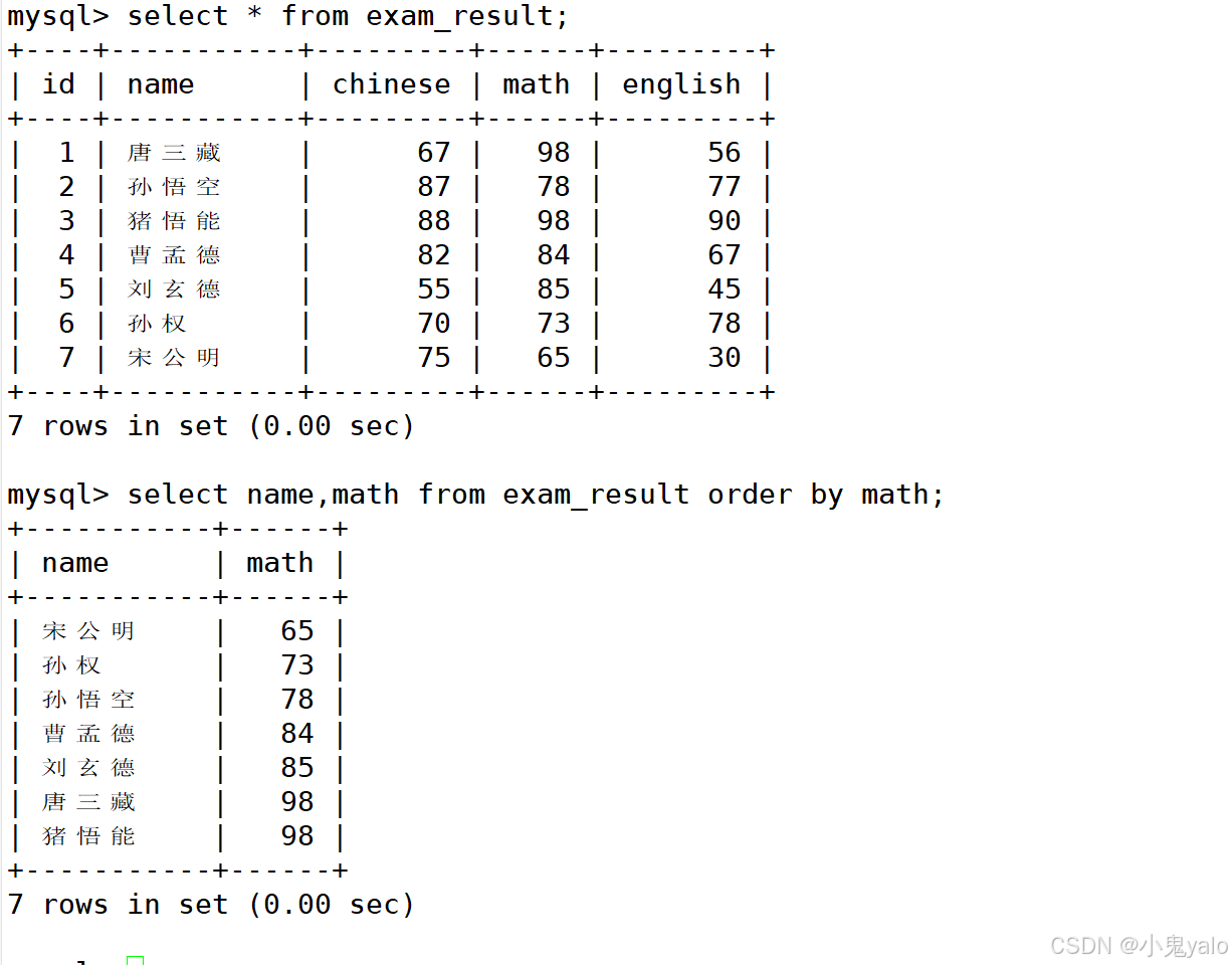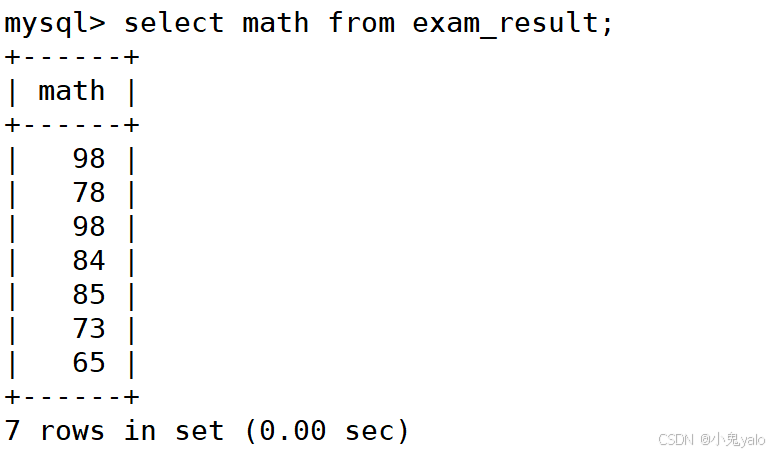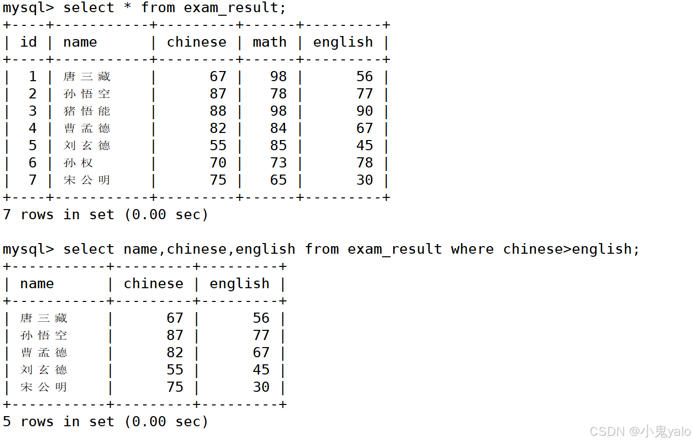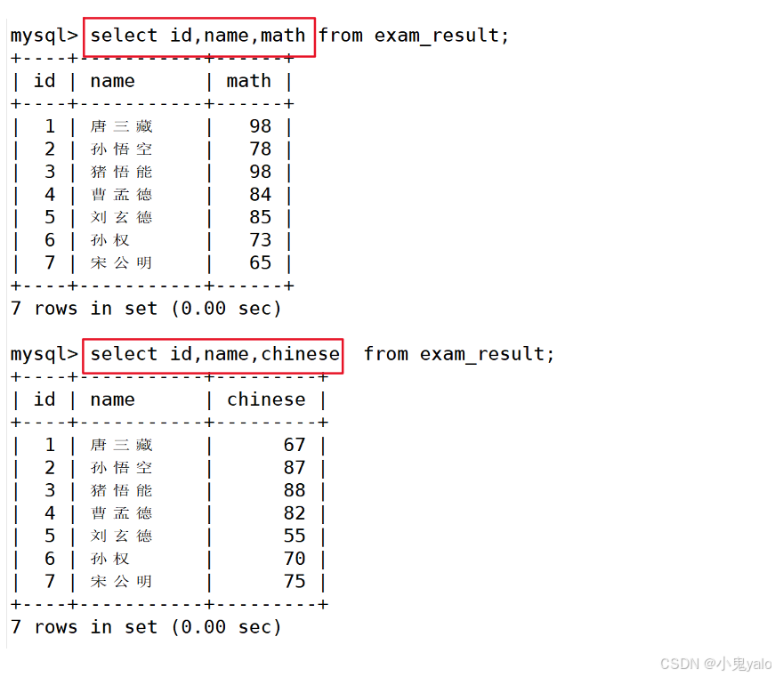 mysql> select id,name,math from exam_result; mysql> select id,name,chinese from exam_result;