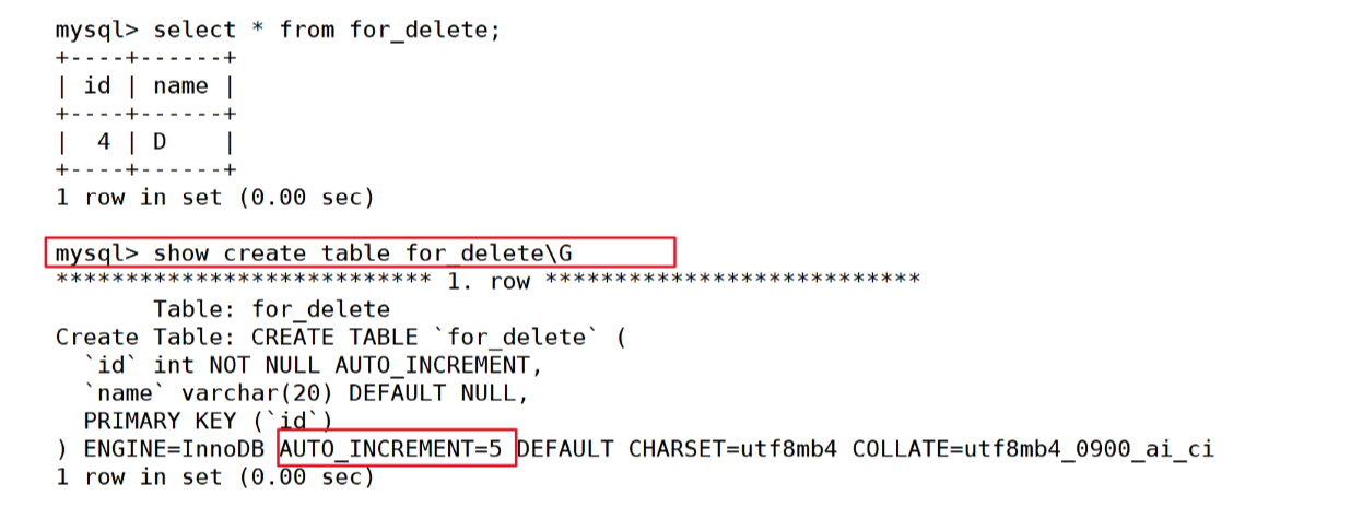 mysql> show create table for_delete\G