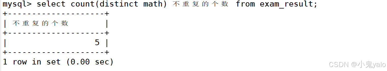 mysql> select count(distinct math) 不重复的个数 from exam_result;