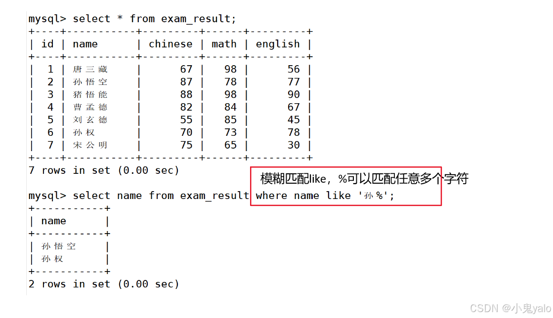 mysql> select name from exam_result where name like '孙%';