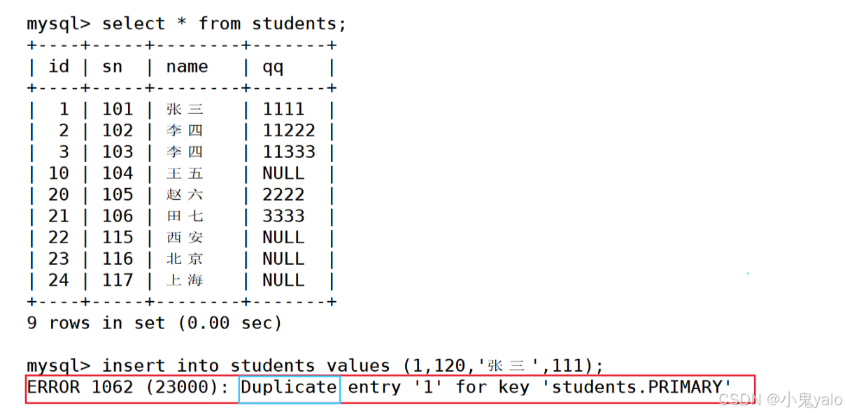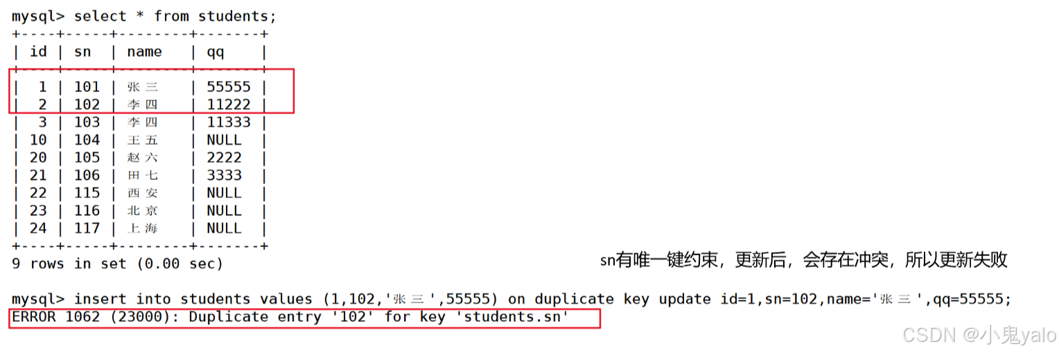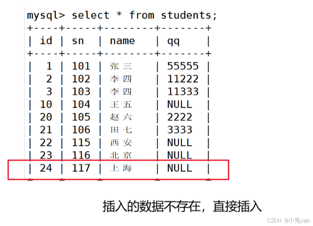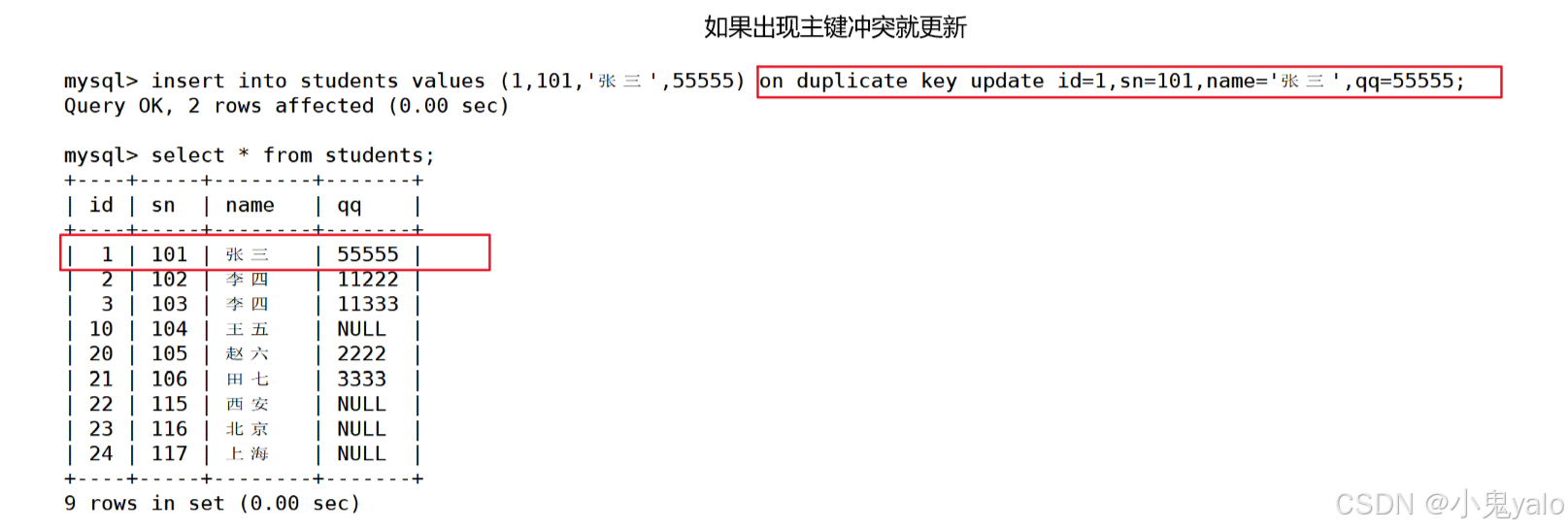 mysql> insert into students values (1,101,'张三',55555) on duplicate key update id=1,sn=101,name='张三',qq=55555;