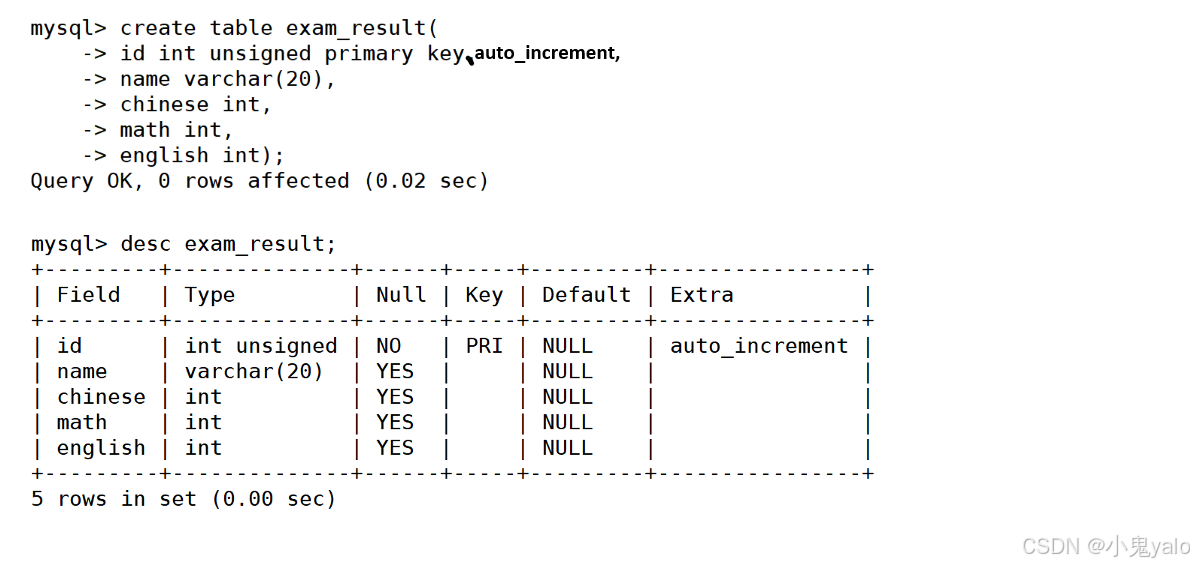 mysql> create table exam_result( -> id int unsigned primary key auto_increment, -> name varchar(20), -> chinese int, -> math int, -> english int);