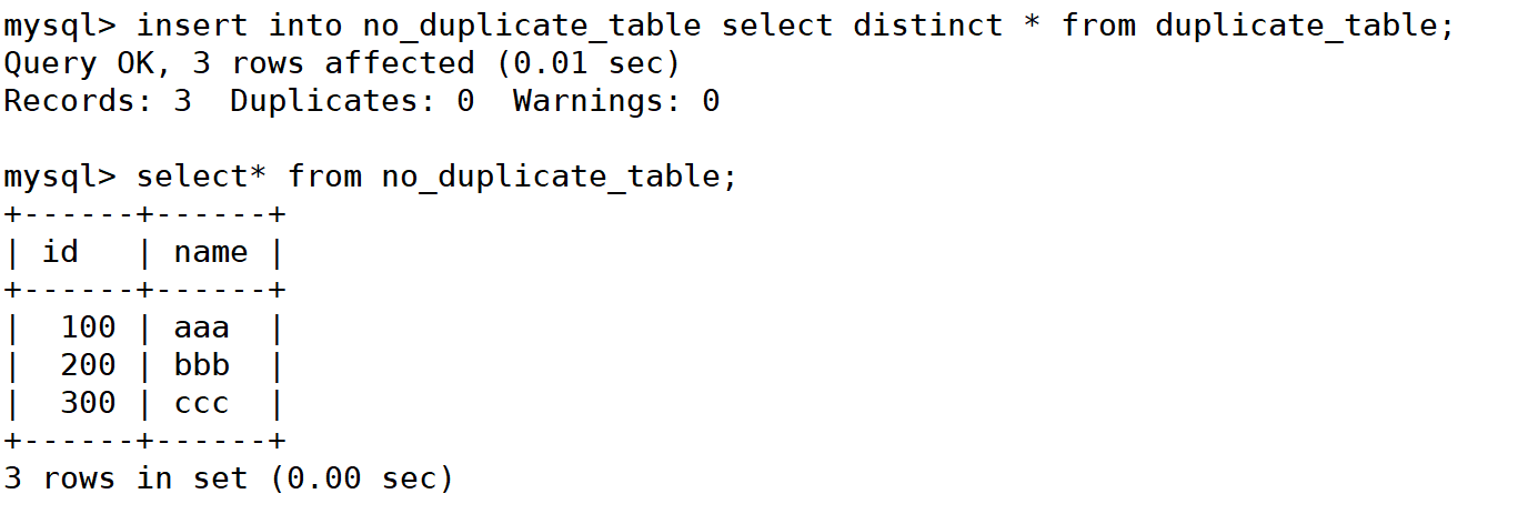 mysql> insert into no_duplicate_table select distinct * from duplicate_table;