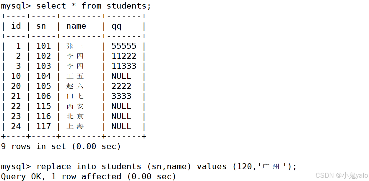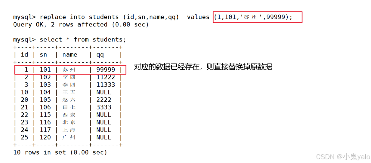 mysql> replace into students (sn,name) values (120,'广州');//不存在直接插入 mysql> replace into students (id,sn,name,qq) values (1,101,'苏州',99999);//数据已经存在,则替换掉原数据