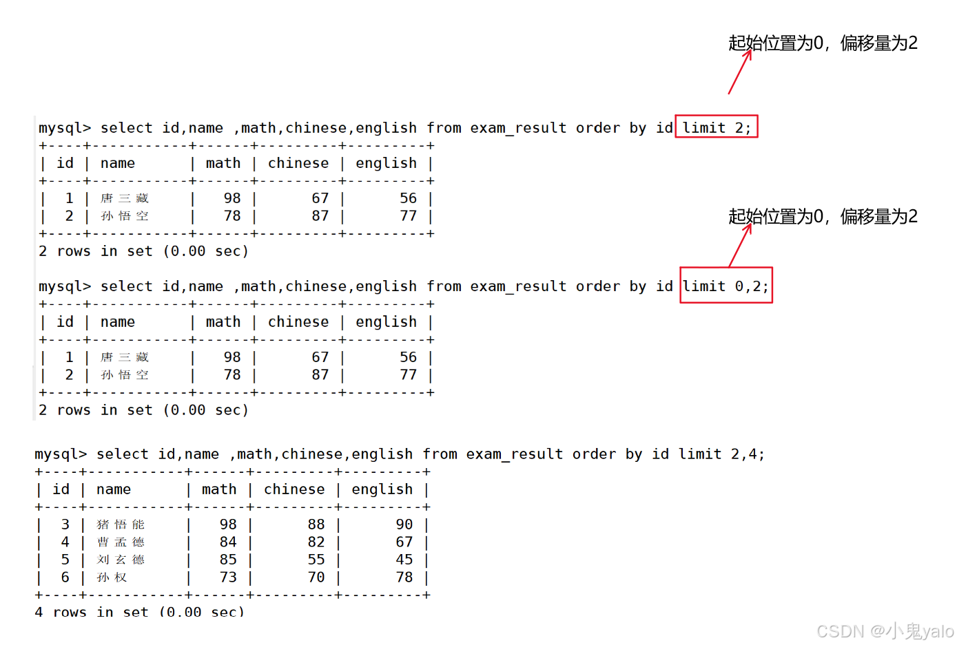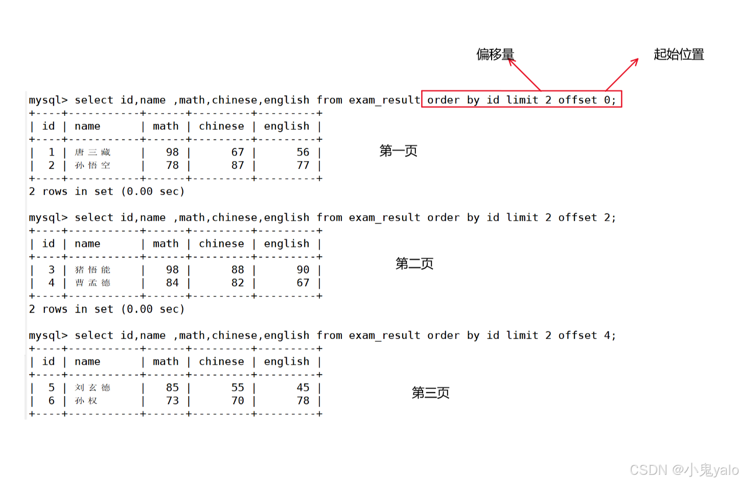 ----起始下标从0开始 ---从0开始,筛选n条结果 select ......from table_name [where...] [order by...] limit n; ---从s开始,筛选n条结果 select ......from table_name [where...] [order by...] limit s,n; ---从s开始,筛选n条结果,和第二种方法表示一样 select ......from table_name [where...] [order by...] limit n offset s;