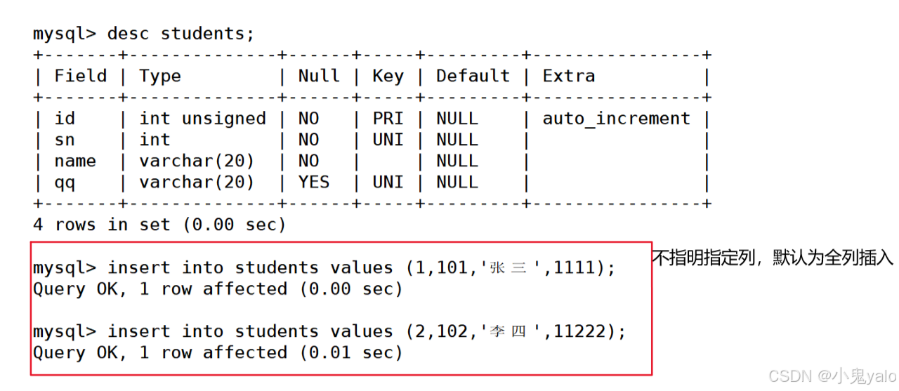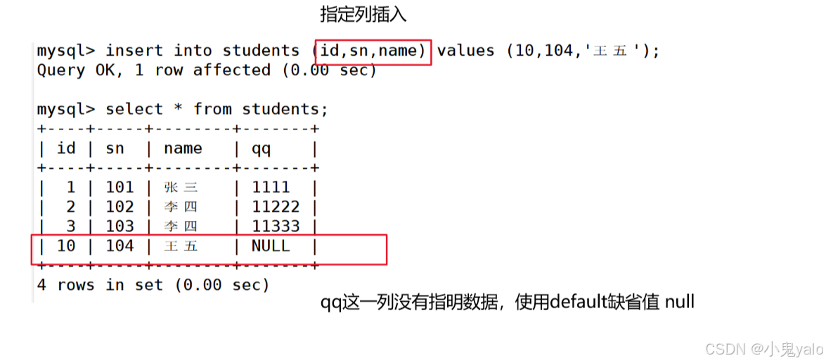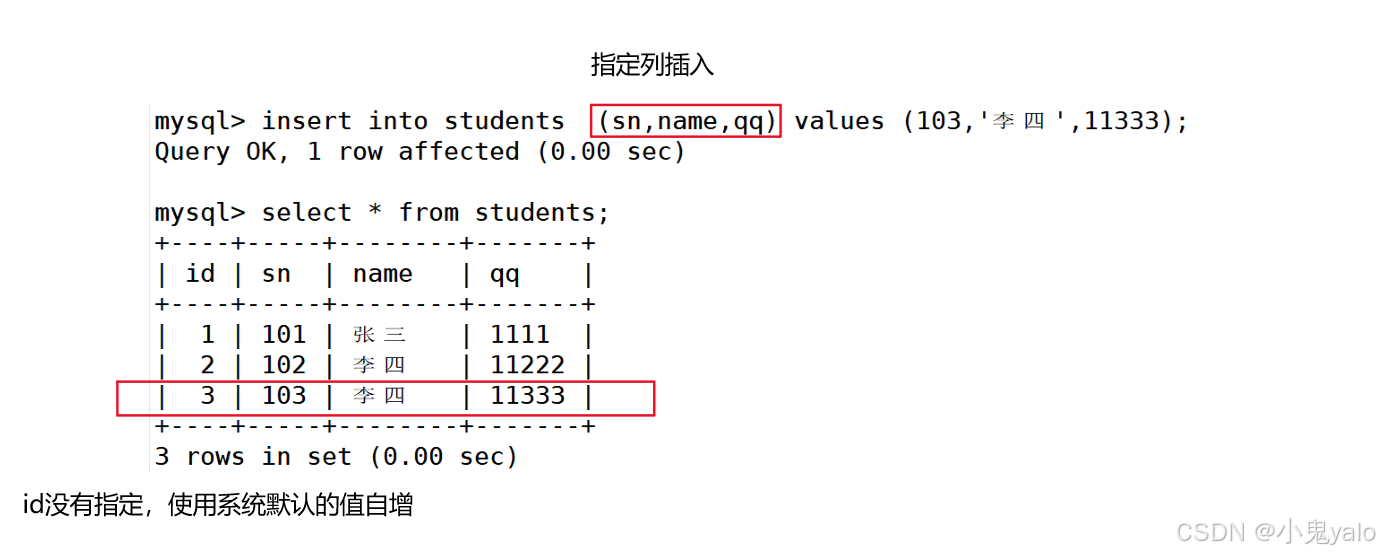 mysql> insert into students (sn,name,qq) values (103,'李四',11333); mysql> insert into students (id,sn,name) values (10,104,'王五');