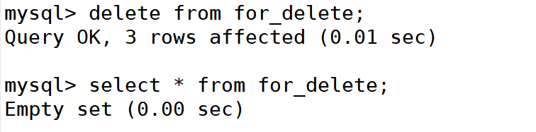 mysql> delete from for_delete; mysql> select * from for_delete;
