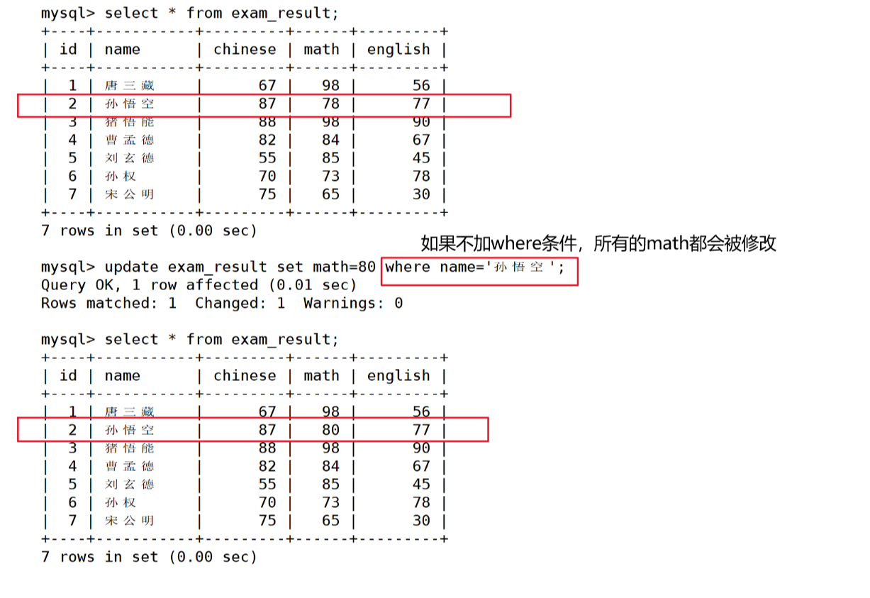 mysql> update exam_result set math=80 where name='孙悟空';