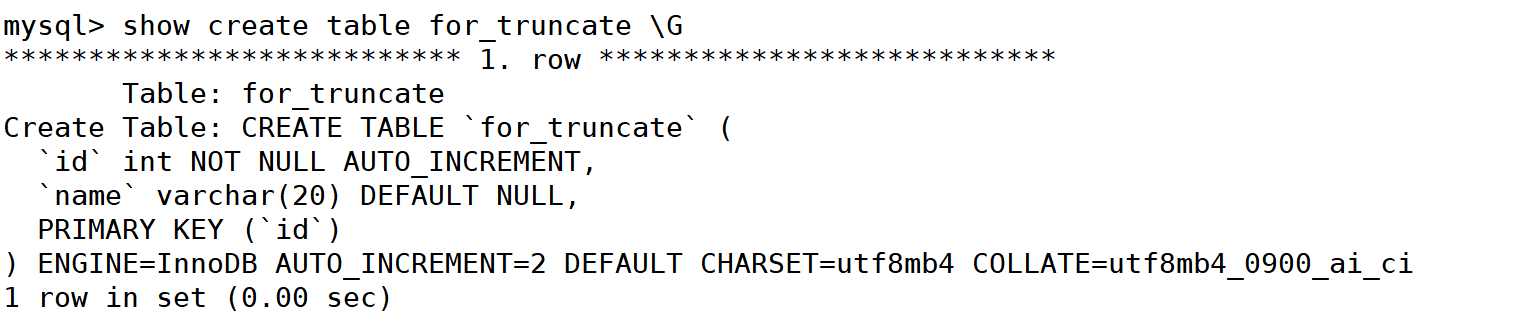 mysql> show create table for_truncate \G