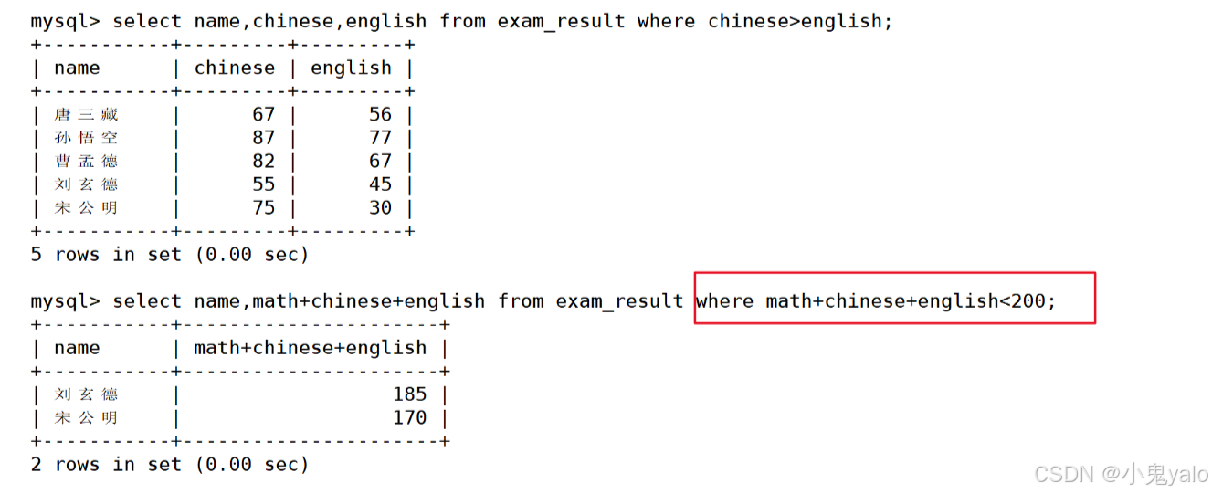 mysql> select name,math+chinese+english from exam_result where math+chinese+english<200;