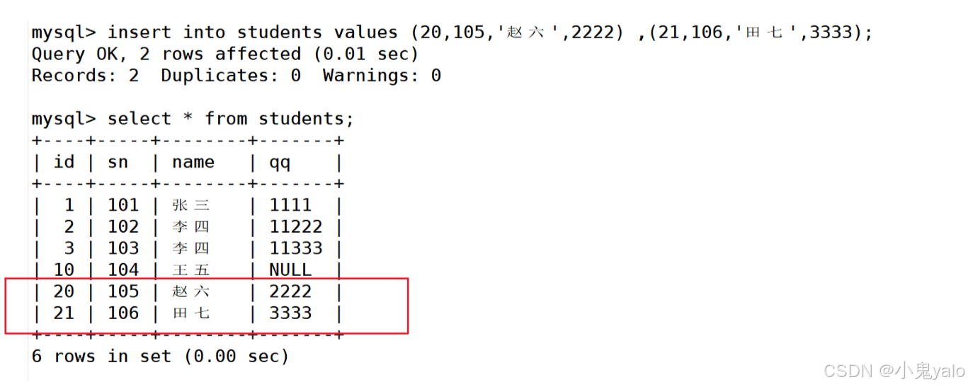 mysql> insert into students values (20,105,'赵六',2222) ,(21,106,'田七',3333);