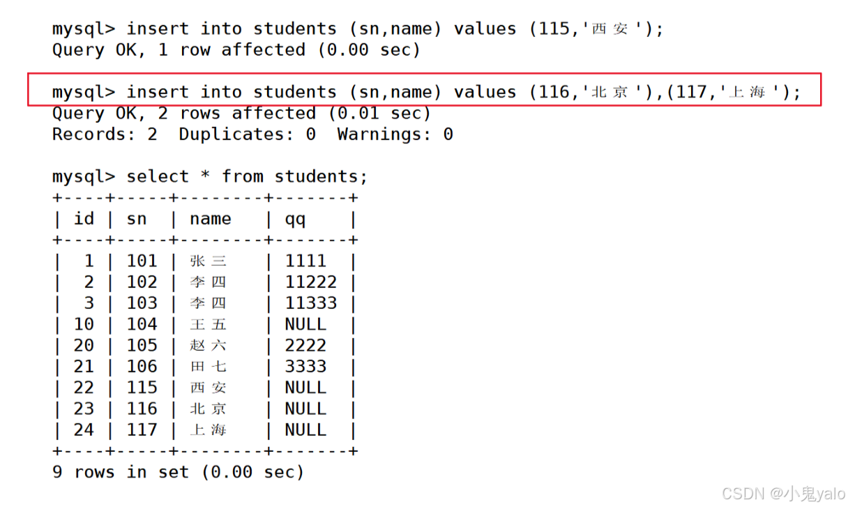 mysql> insert into students (sn,name) values (116,'北京'),(117,'上海');