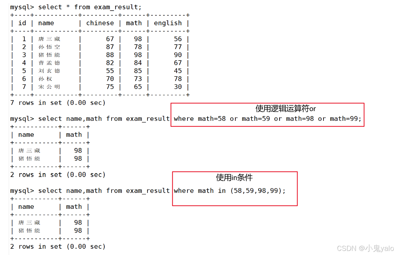 mysql> select name,math from exam_result where math=58 or math=59 or math=98 or math=99; mysql> select name,math from exam_result where math in (58,59,98,99);