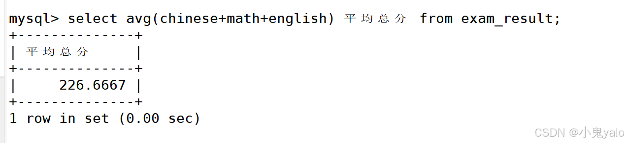 mysql> select avg(chinese+math+english) 平均总分 from exam_result;