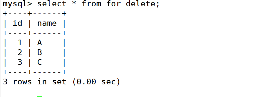 mysql> insert into for_delete values (1,'A'),(2,'B'),(3,'C');
