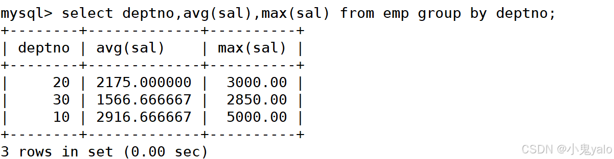 mysql> select deptno,avg(sal),max(sal) from emp group by deptno;