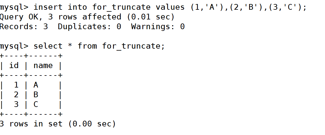 mysql> insert into for_truncate values (1,'A'),(2,'B'),(3,'C'); mysql> select * from for_truncate;